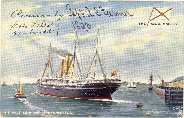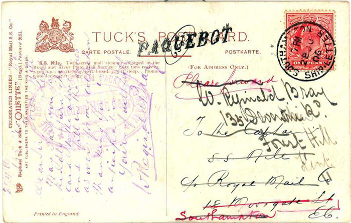 Picture postcard sent by Bray to The Captain, S.S. Nile, c/o Royal Mail on 25th April 1906 asking for information to be supplied.