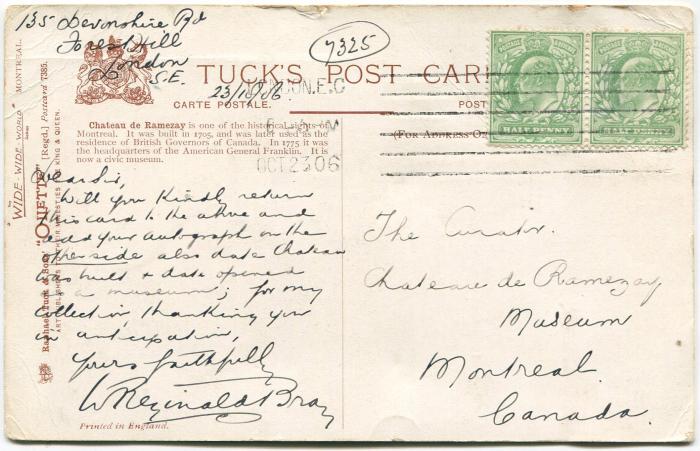 Picture postcard sent by Bray to The Curator, Chateau de Ramezay Museum, Montreal, Canada on 23rd October 1906 asking for his autograph and some information to be supplied.