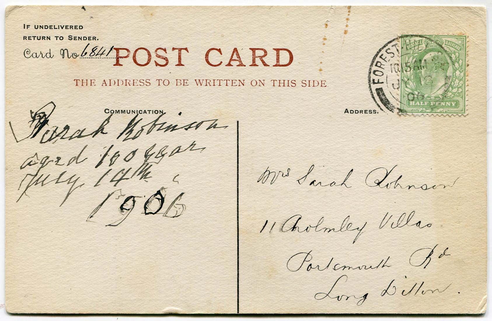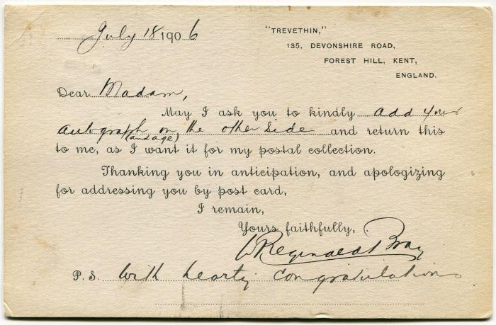 Picture postcard sent by Bray to Mrs Sarah Robinson on 18th July 1906 asking for her autograph.