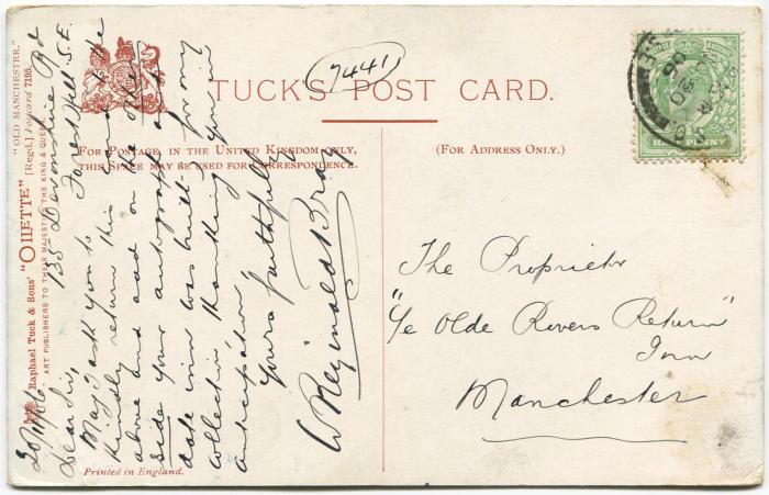 Picture postcard sent by Bray to The Proprietor, The Olds Rovers Return Inn, Manchester on 20th November 1906 asking for his autograph and some information to be supplied.