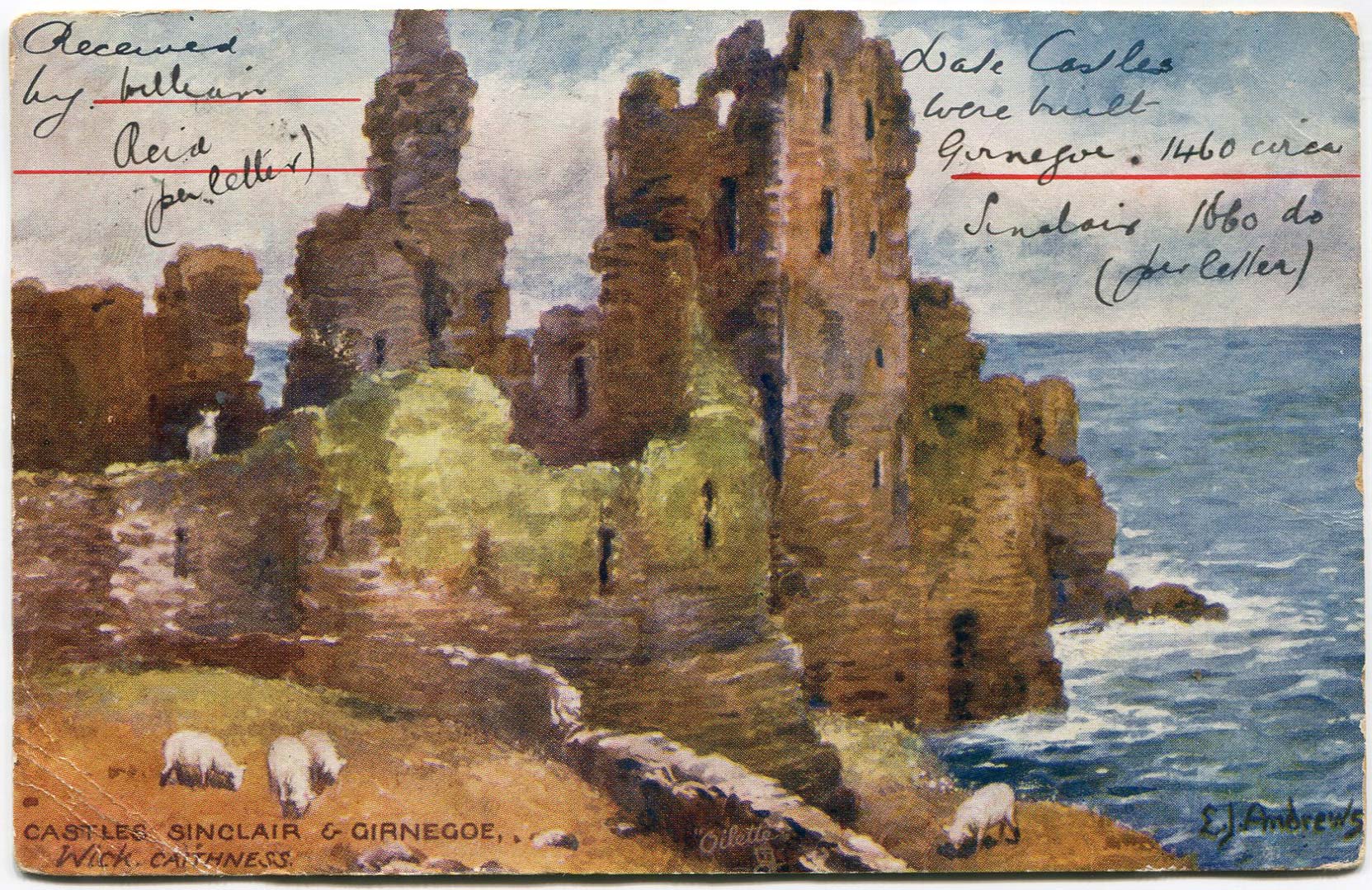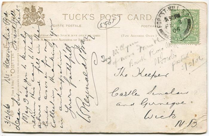 Picture postcard sent by Bray to The Keeper, Castles Sinclair and Girnegoe, Wick, N.B. on 3rd February 1906 asking for information to be supplied.