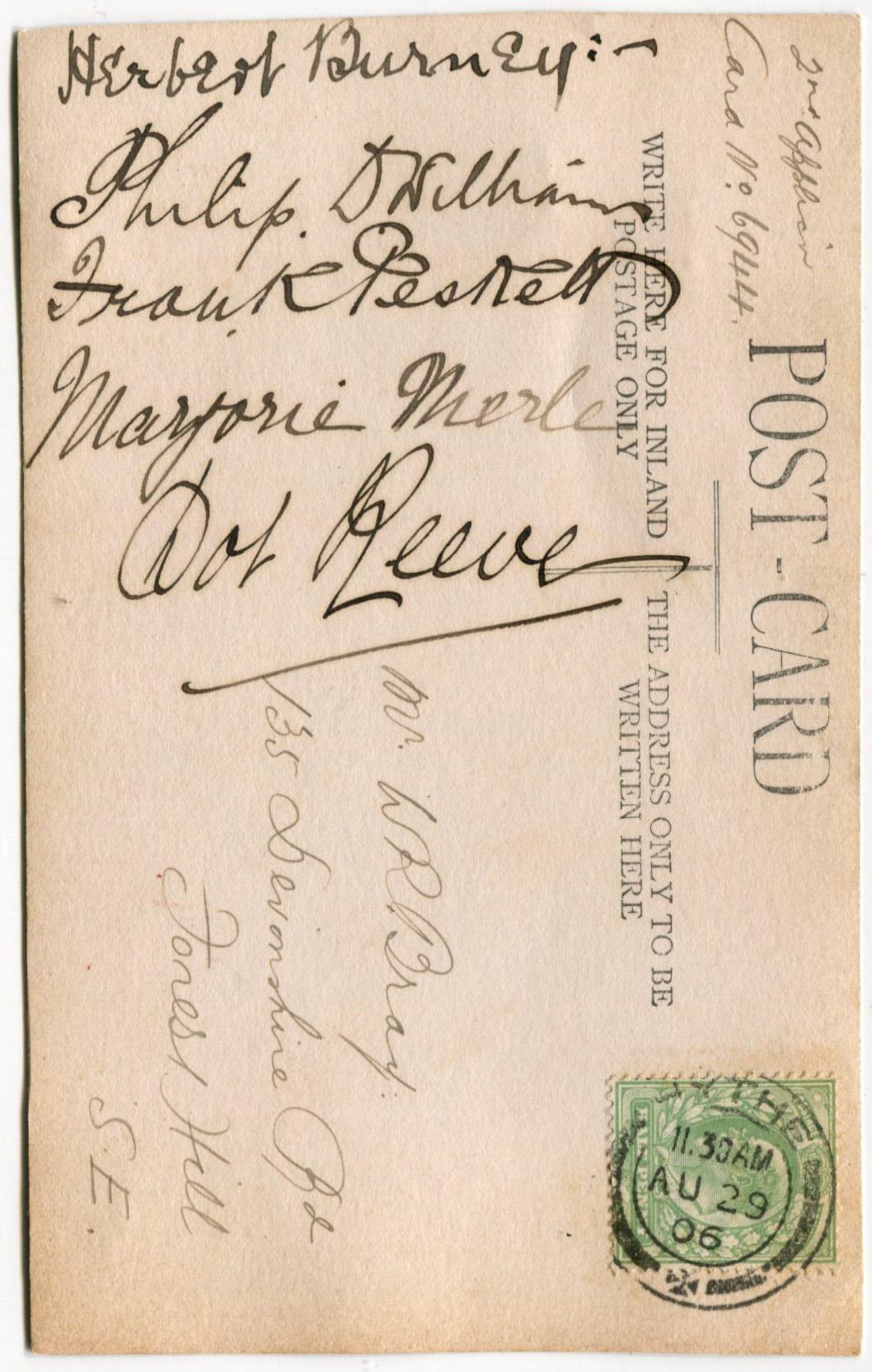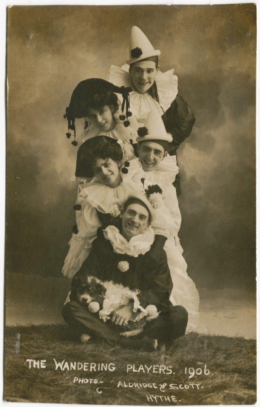 Picture postcard sent to Bray by The Wandering Players on 29th August 1906 in response to a request for their autographs.