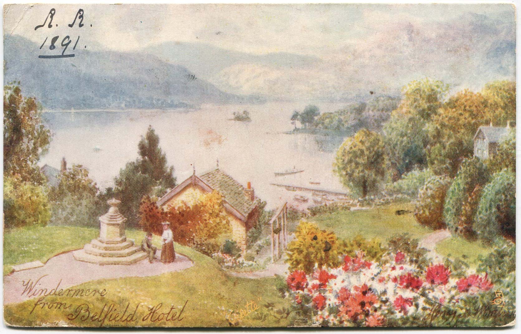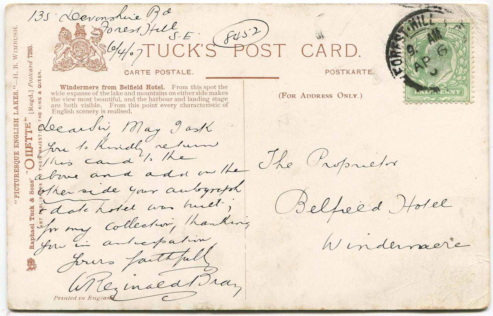 Picture postcard sent by Bray to The Proprietor, Belfield Hotel, Windermere on 6th April 1907 asking for his autograph and some information to be supplied.