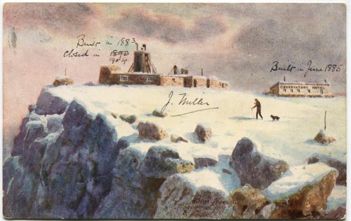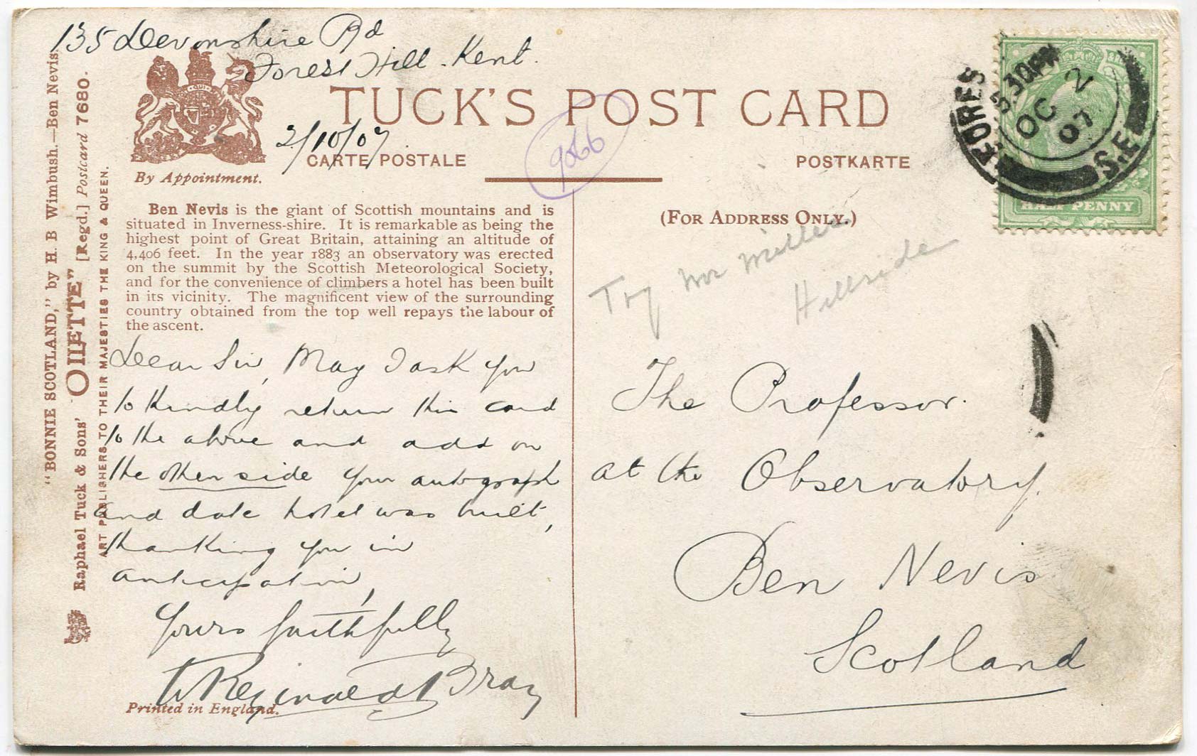 Picture postcard sent by Bray to The Professor at the Observatory, Ben Nevis, Scotland on 2nd October 1907 asking for his autograph and some information to be supplied.