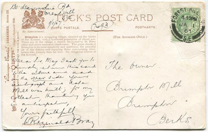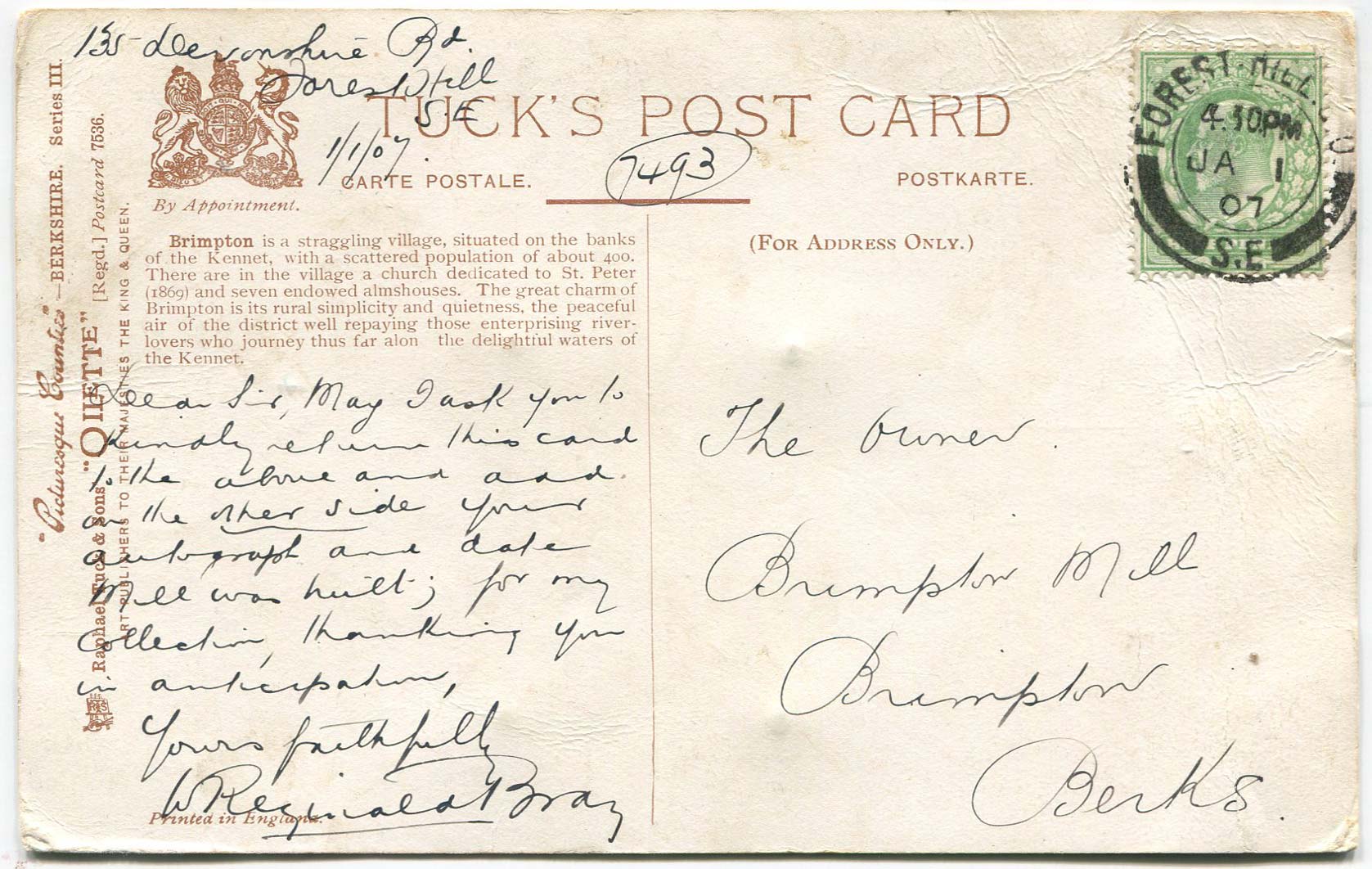 Picture postcard sent by Bray to The Owner, Brimpton Mill, Brimpton, Berks on 1st January 1907 asking for his autograph and some information to be supplied.