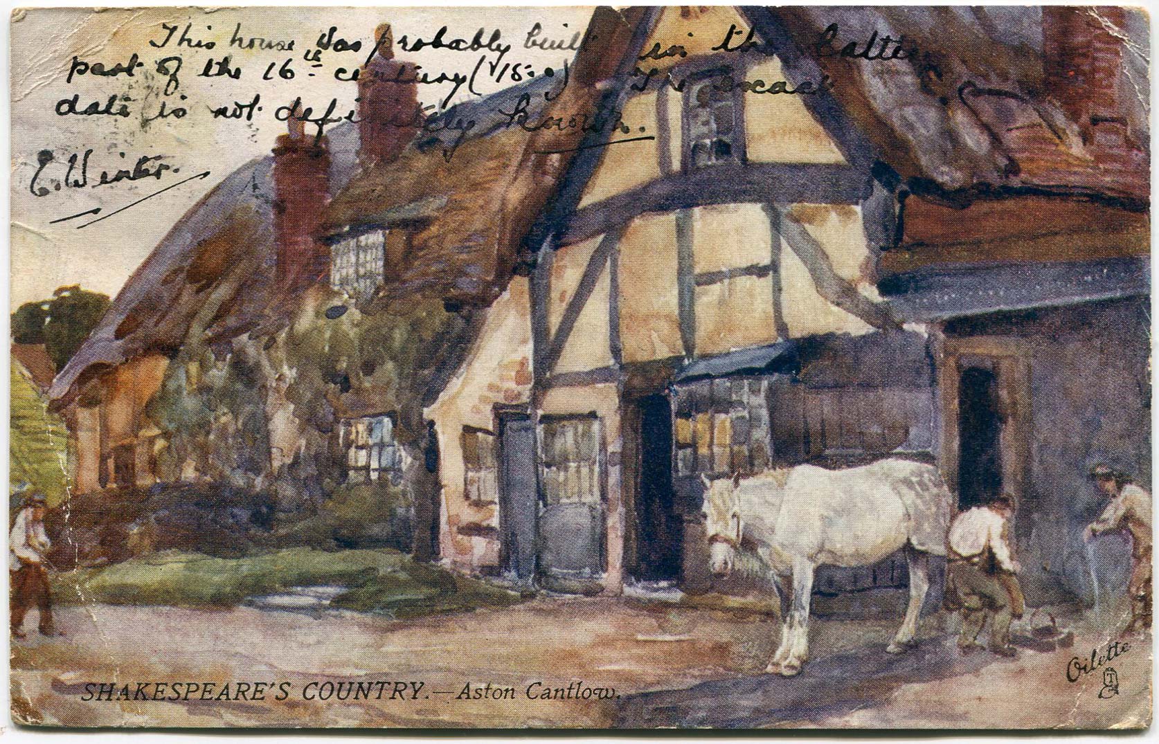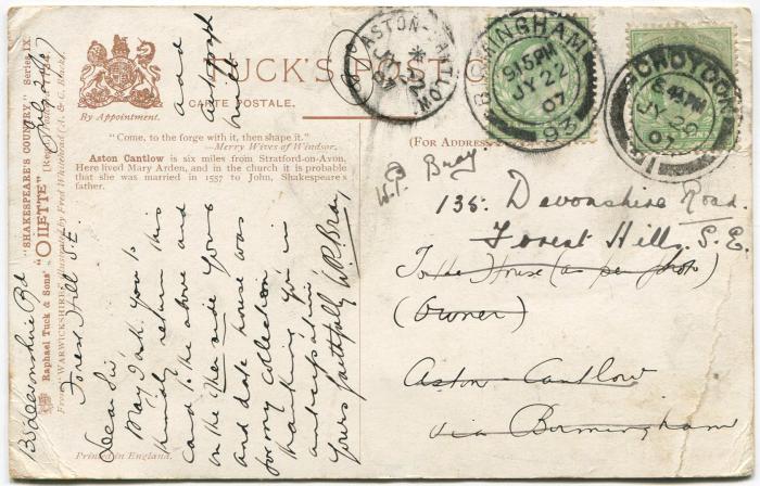 Picture postcard sent by Bray to The House (as per photo), (Owner), Aston Cantlow, via Birmingham on 20th July 1907 asking for his autograph and some information to be supplied.
