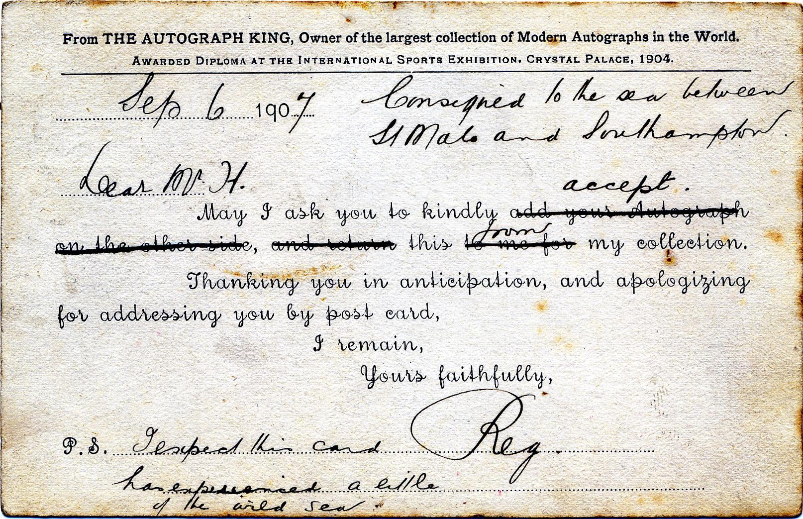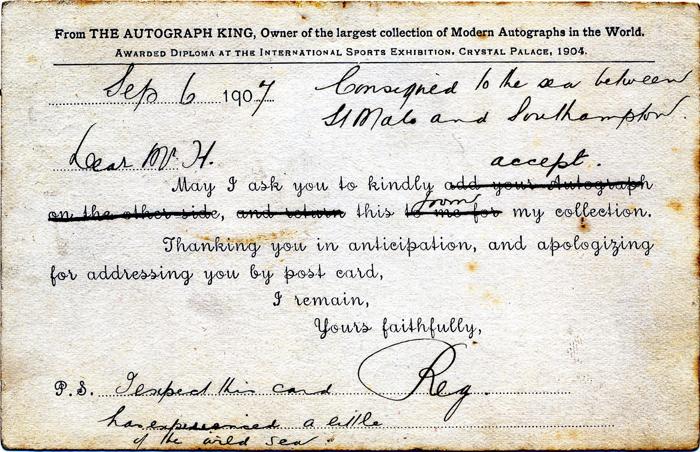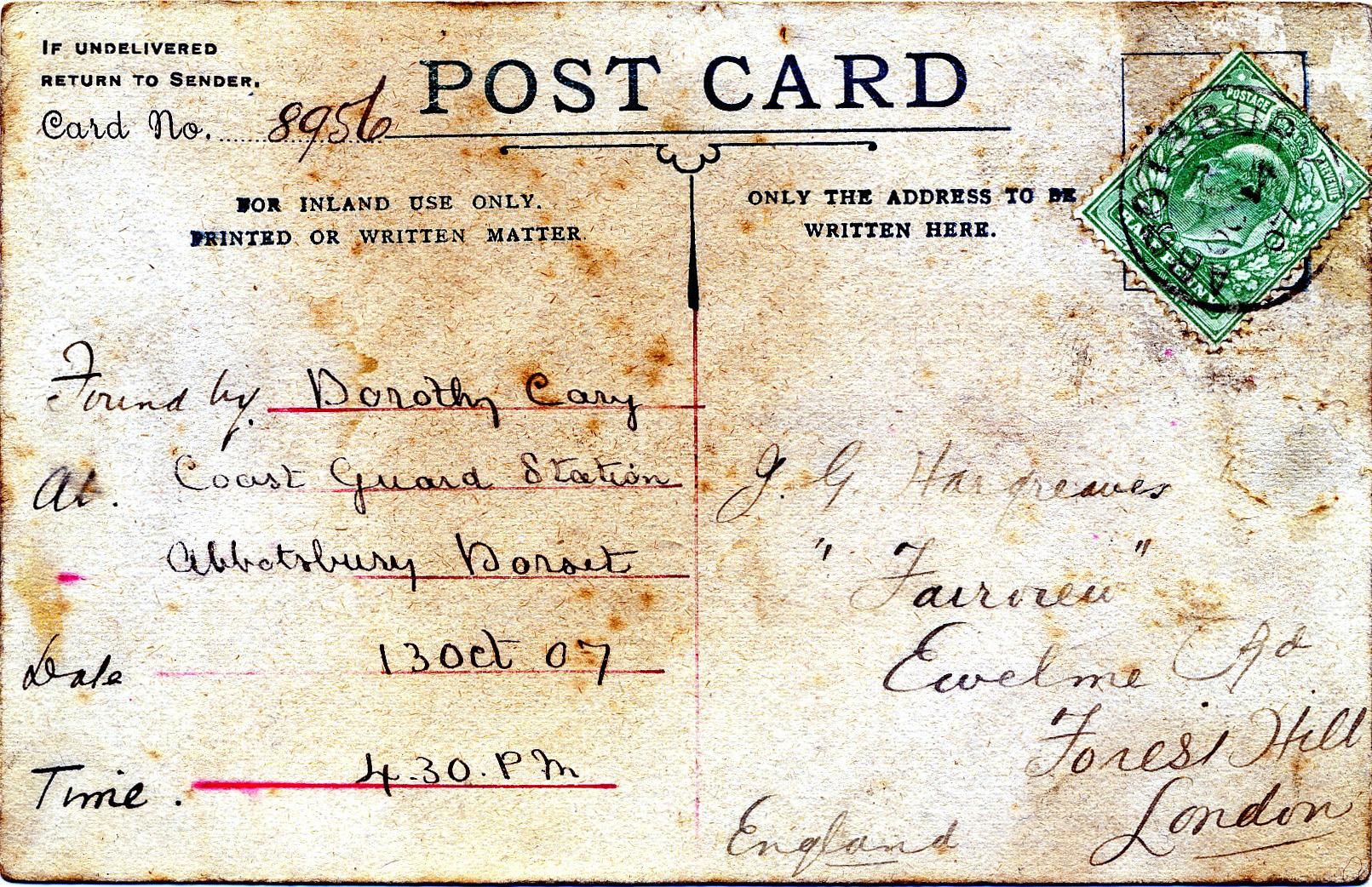 Postcard thrown by Bray into the sea between St. Malo and Southampton on 6th September 1907 asking for its return.