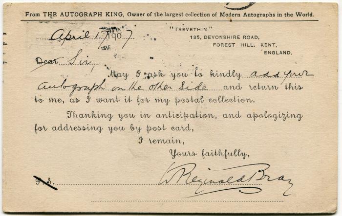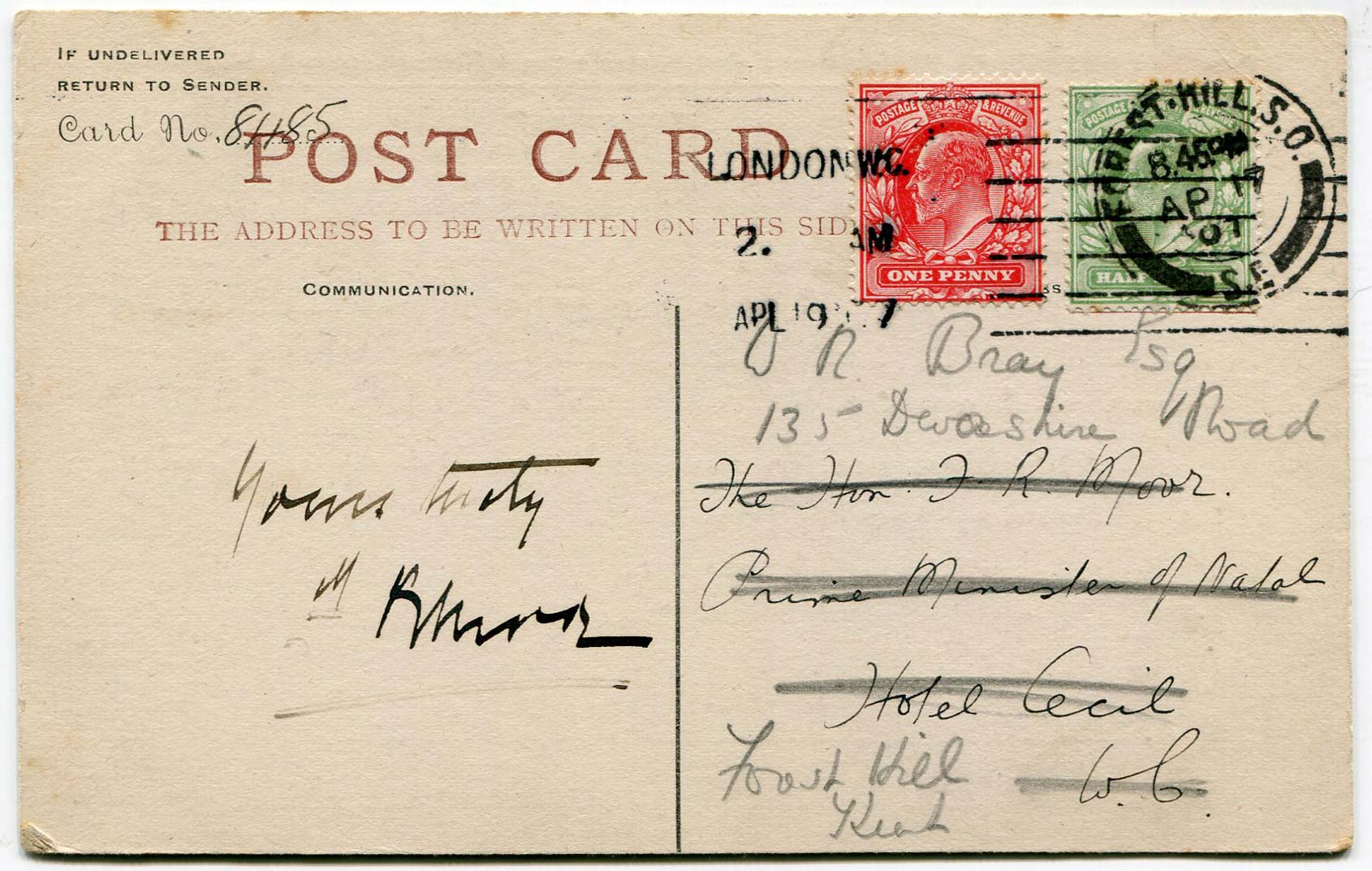 Postcard sent by Bray to Frederick Moor, Prime Minister of Natal on 17th April 1907 asking for his autograph.