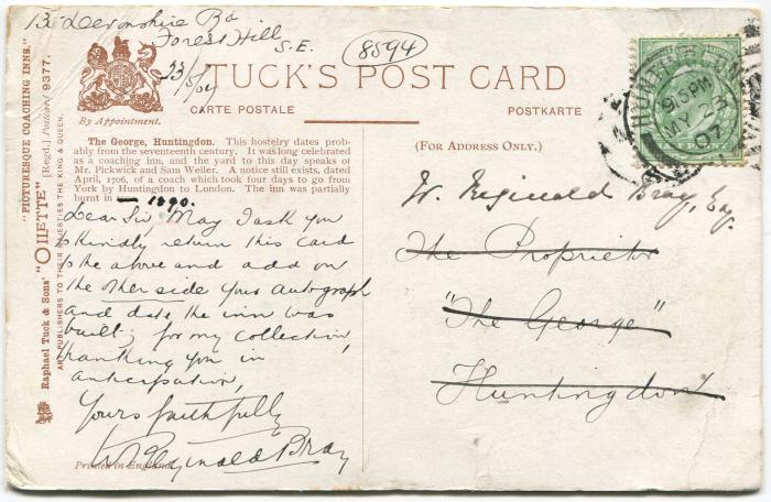 Picture postcard sent by Bray to The Proprietor, "The George", Huntingdon on 23rd May 1907 asking for his autograph and some information to be supplied.