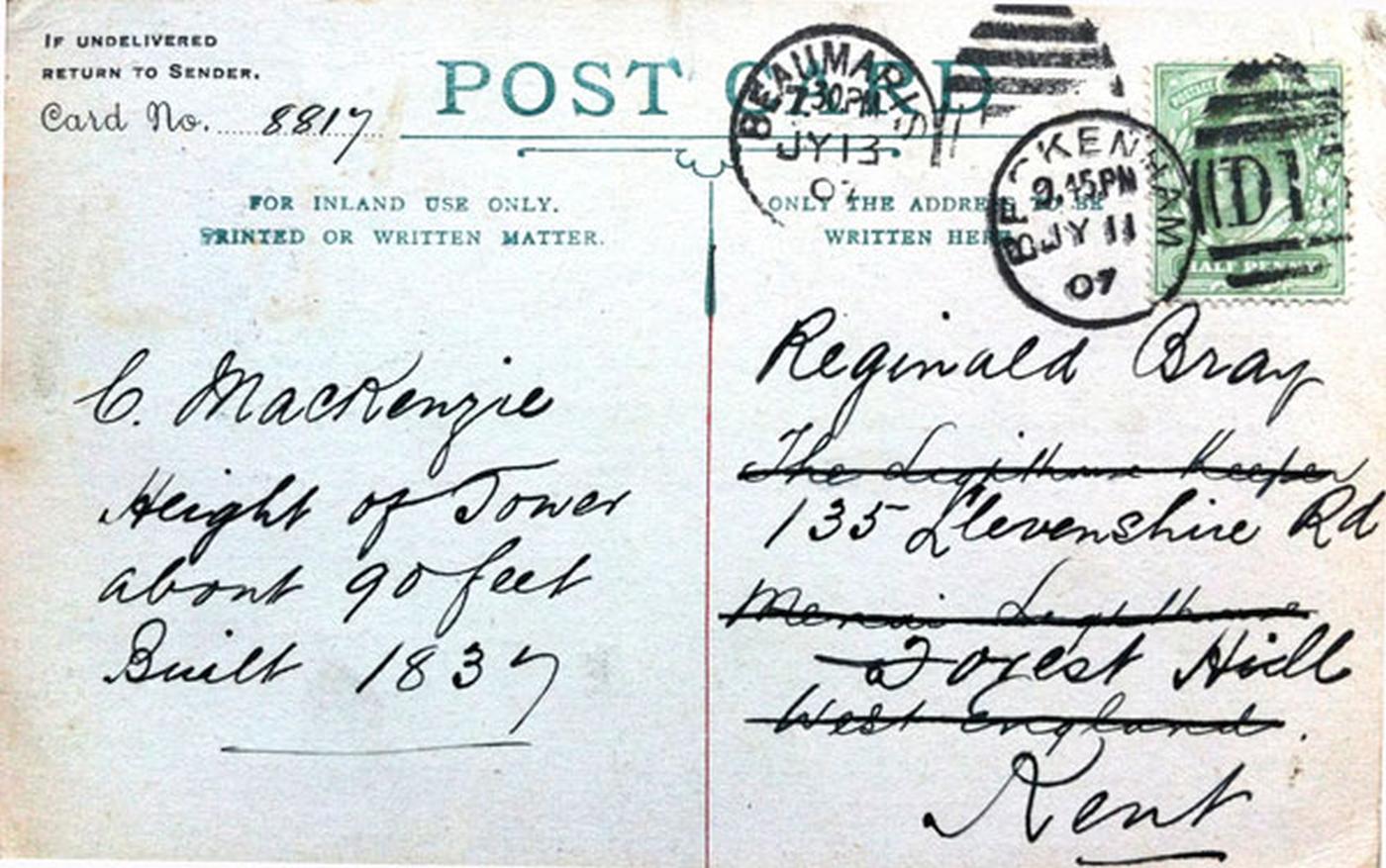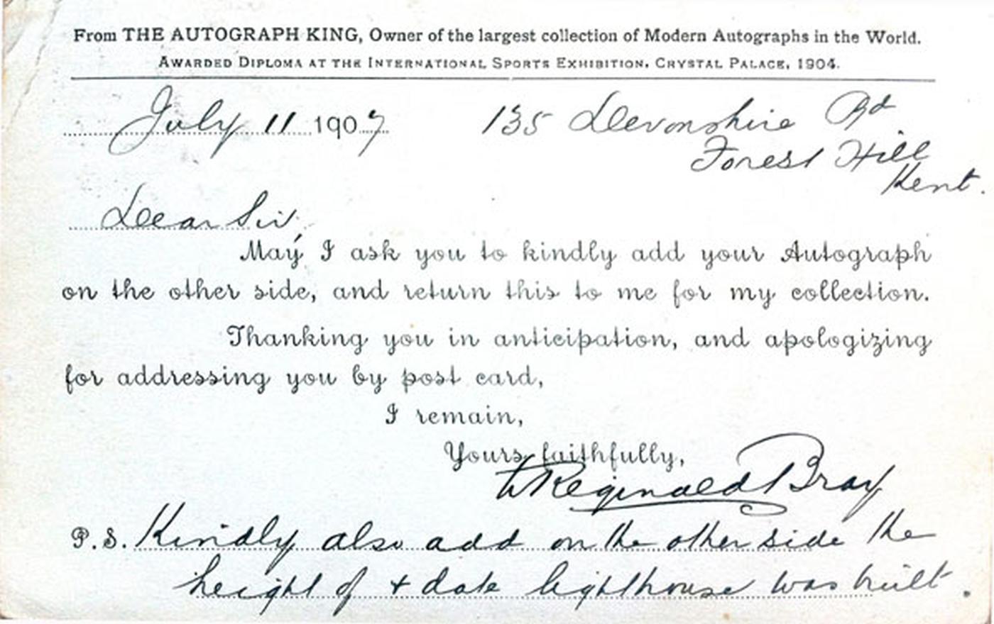 Postcard sent by Bray to The Lighthouse Keeper, Menai Lighthouse on 11th July 1907 asking for his autograph.