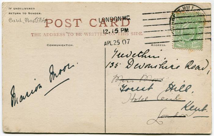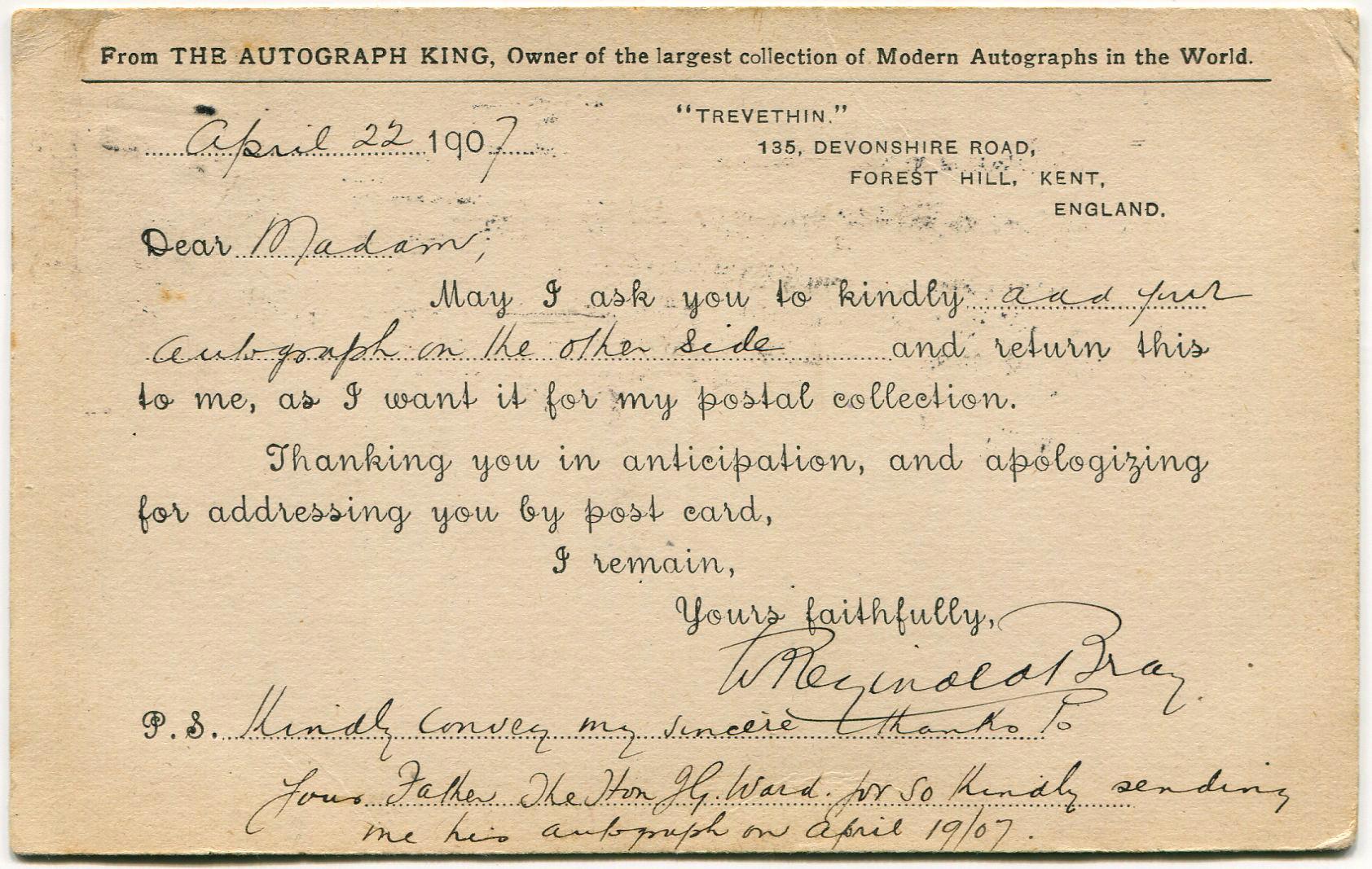 Postcard sent by Bray to Marion Moor on 22nd April 1907 asking for her autograph.