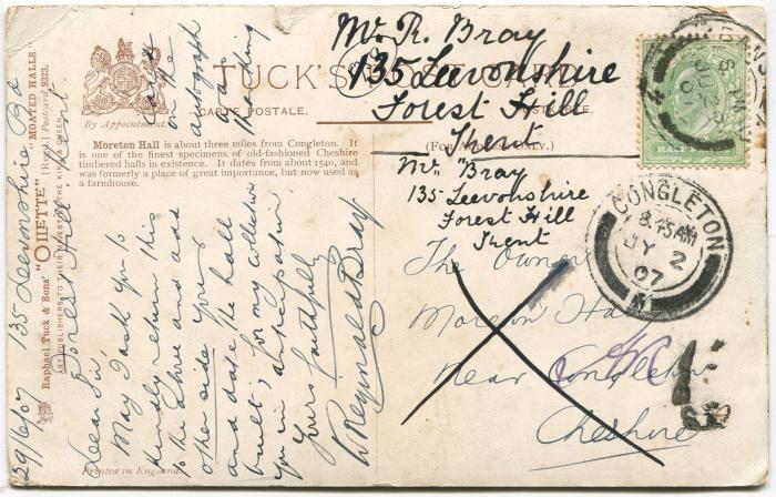 Picture postcard sent by Bray to The Owner, Moreton Hall, near Congleton, Cheshire on 29th June 1907 asking for his autograph and some information to be supplied.