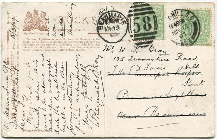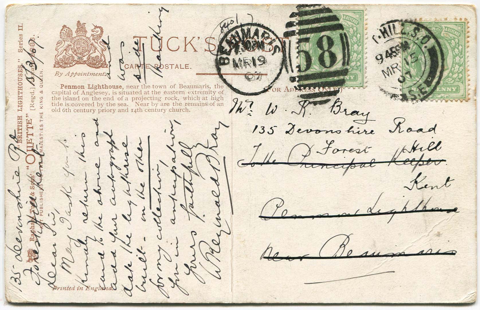 Picture postcard sent by Bray to The Principal Keeper, Penmon Lighthouse, near Beaumaris on 15th March 1907 asking for his autograph and some information to be supplied.