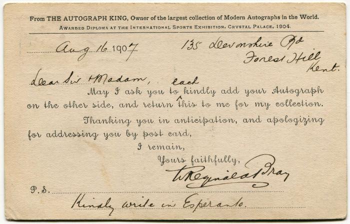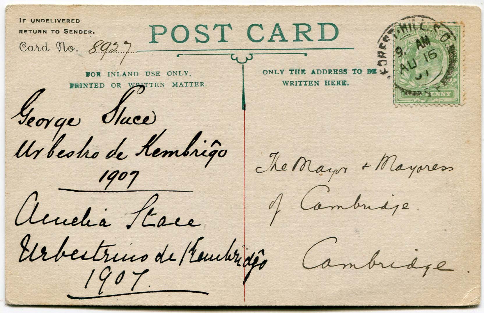 Postcard sent by Bray to George and Amelia Stace, Mayor and Mayoress of Cambridge on 16th August 1907 asking for their autographs.