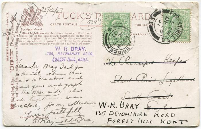 Picture postcard sent by Bray to The Principal Keeper, Start Point Lighthouse, South Coast, England on 25th December 1907 asking for his autograph and some information to be supplied.