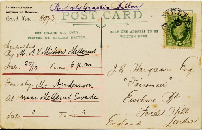 The Daily Graphic was a mass circulation newspaper in the Edwardian era and in 1907 it sponsored a balloon flight, as an advertising venture. It printed hundreds of miniature booklets giving details of the flight and advertising the Daily Graphic. The aviators planned to jettison these booklets en route as ballast, in the same way that earlier balloon pilots had jettisoned sand to maintain the height of the balloon. The coal-gas filled balloon, named Mammoth, took off from Crystal Palace, London at 5 pm on October 12th 1907, with a crew of three and 15,000 postcards. It drifted for 20 hours and 30 minutes over the North Sea and Denmark, eventually crash landing near the village of Brackau, near Mellerud, in southern Sweden. The crew escaped unhurt but the balloon careered on for a further 30 miles, scattering its load of postcards over a considerable area. Some cards were found and forwarded to the addressees from Tosse, where the balloon eventually came to rest, but the majority were recovered over a period of several weeks by the Mellerud schoolmaster, Mr Mickow, who had played host to the aviators when they arrived at his door after the balloon’s crash landing.