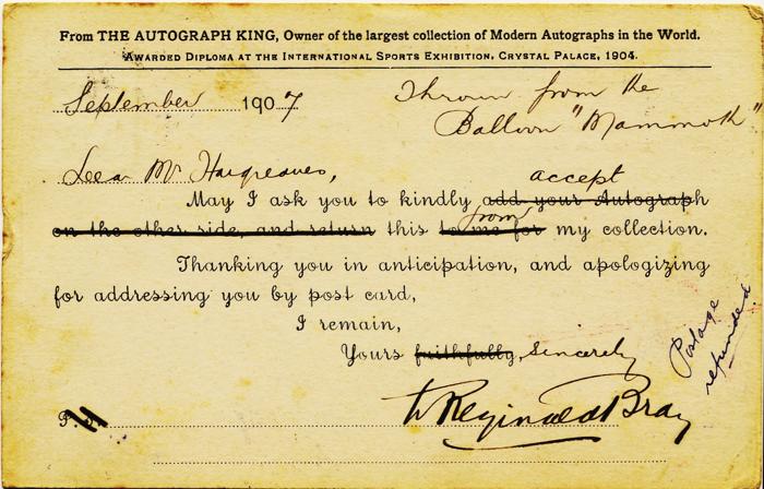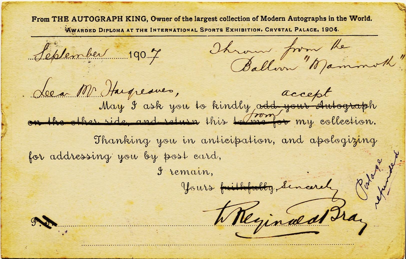 The card was addressed to be sent back to James Hargreaves, Bray's future father-in-law.