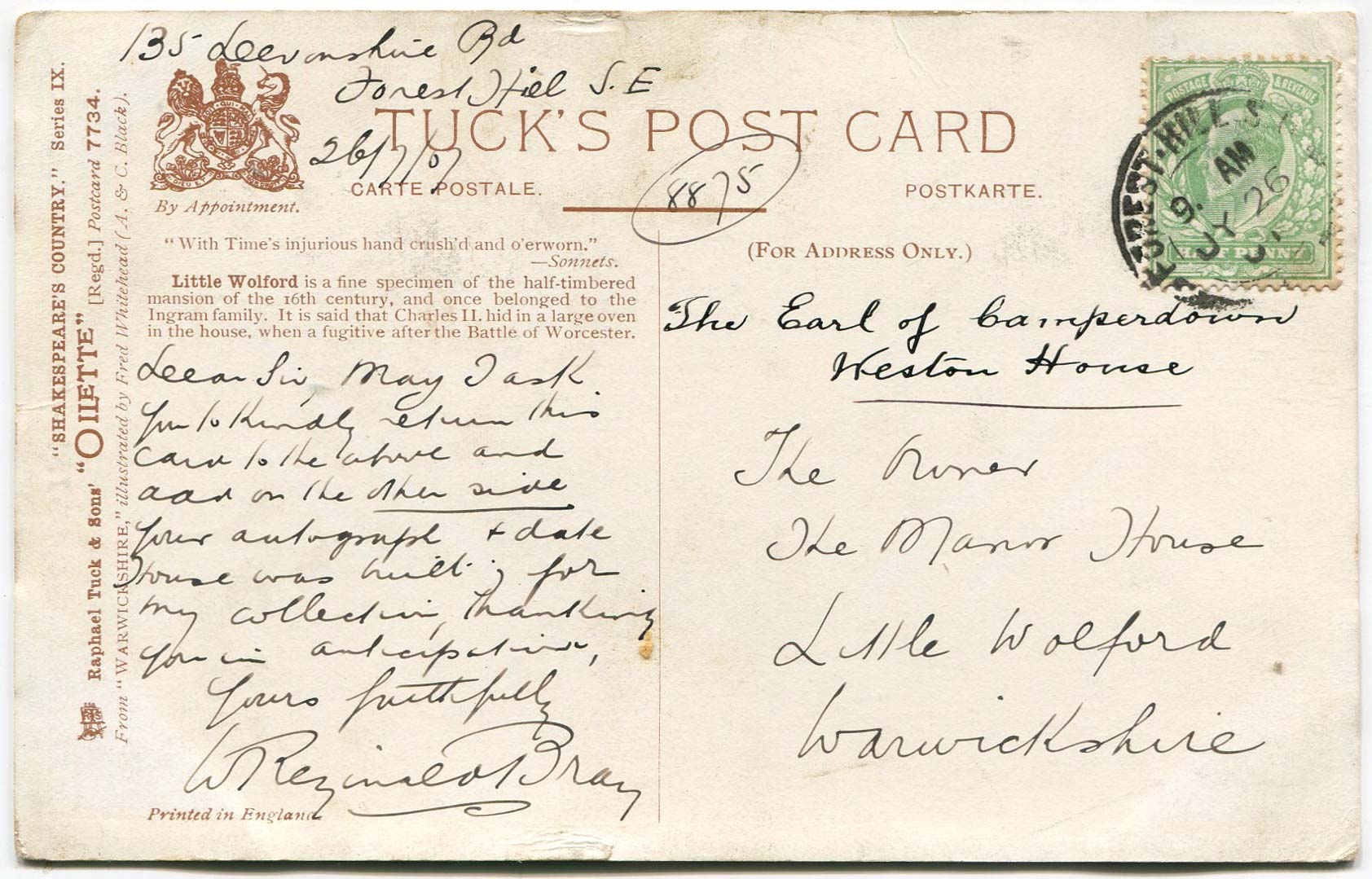 Picture postcard sent by Bray to The Owner, The Manor, House, Little Wolford, Warwickshire on 26th July 1907 asking for his autograph and some information to be supplied.