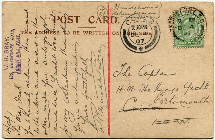 Picture postcard sent by Bray to The Captain, H.M. The King's Yacht, Cowes, IOW on 4th December 1907 asking for his autograph and some information to be supplied.