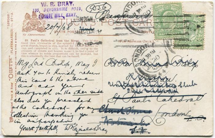 Picture postcard sent by Bray to Wilfrid Bird Hornby, Bishop of Nassau on 20th July 1908 asking for his autograph and some information to be supplied.