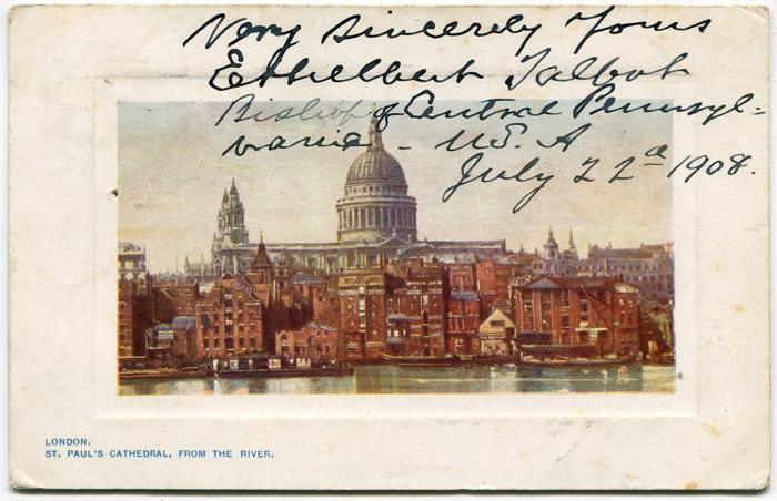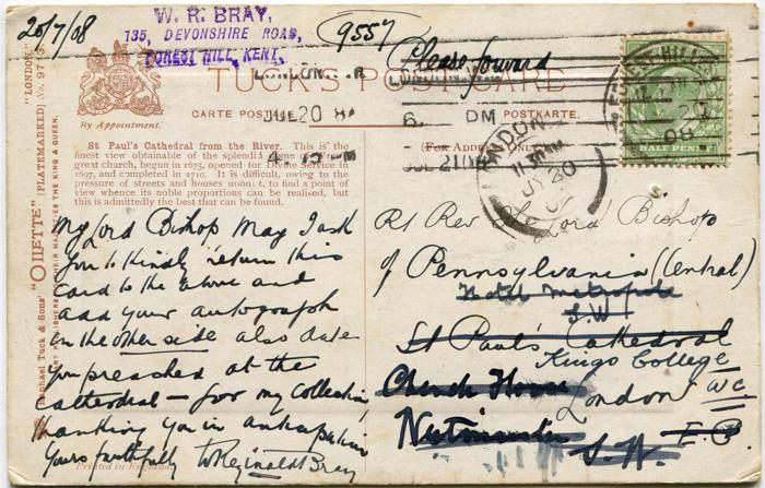 Picture postcard sent by Bray to Ethelbert Talbot, Bishop of Central Pennsylvania on 20th July 1908 asking for his autograph and some information to be supplied.