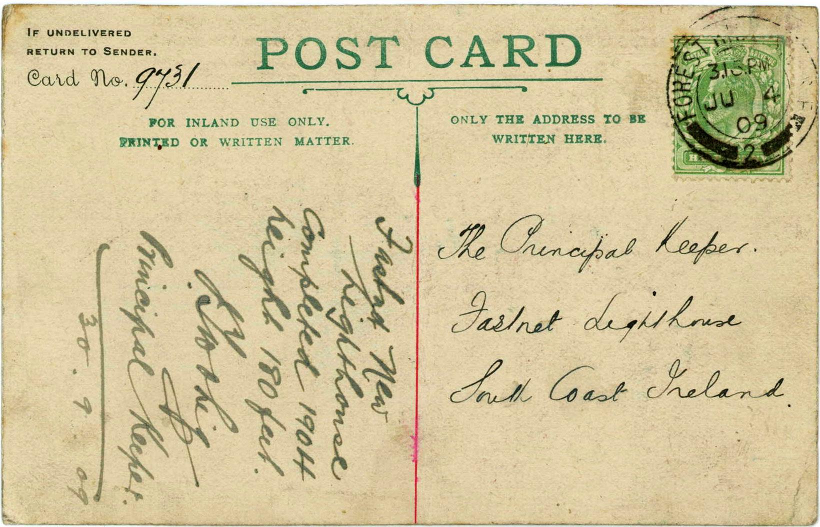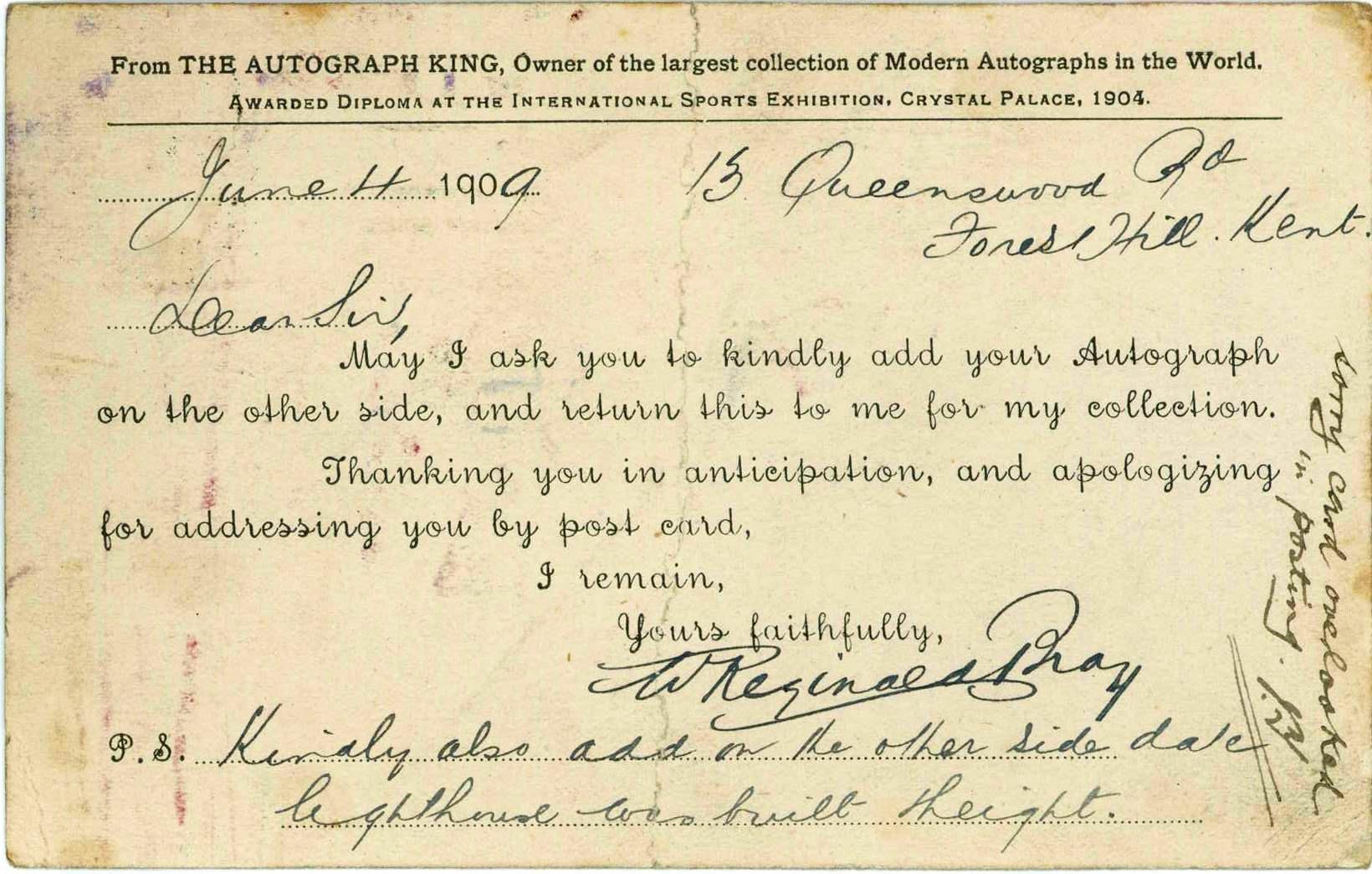 Postcard sent by Bray to The Principal Keeper, Fastnet Lighthouse on 4th June 1909 asking for his autograph