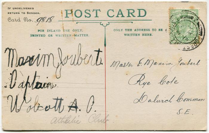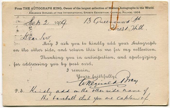 Postcard sent by Bray to Maxim Joubert on 2nd September 1909 asking for his autograph