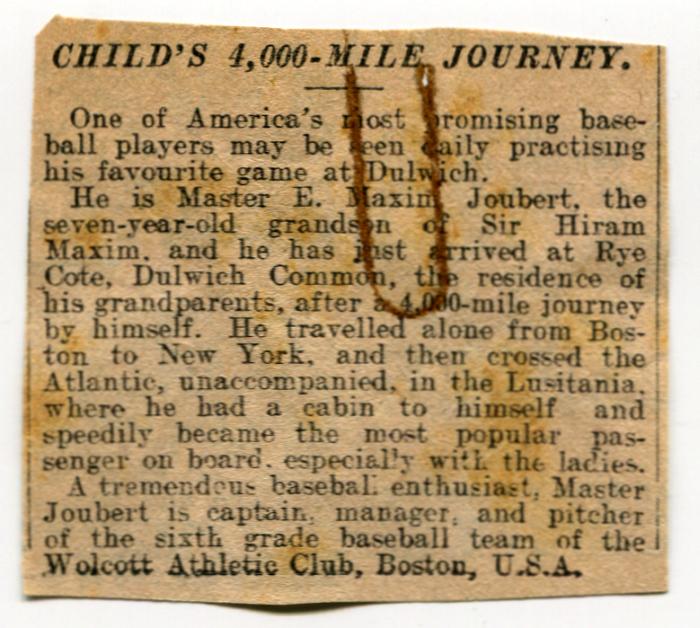 Eldon Maxim Joubert, son of Eldon Gordon and Adelaide Louise (Maxim) Joubert, was born 15 May 1902 in Boston, Massachusetts and died 24 Nov 1980 in London. In 1932, in Wandsworth, London, he married Ivy I. Holmes.