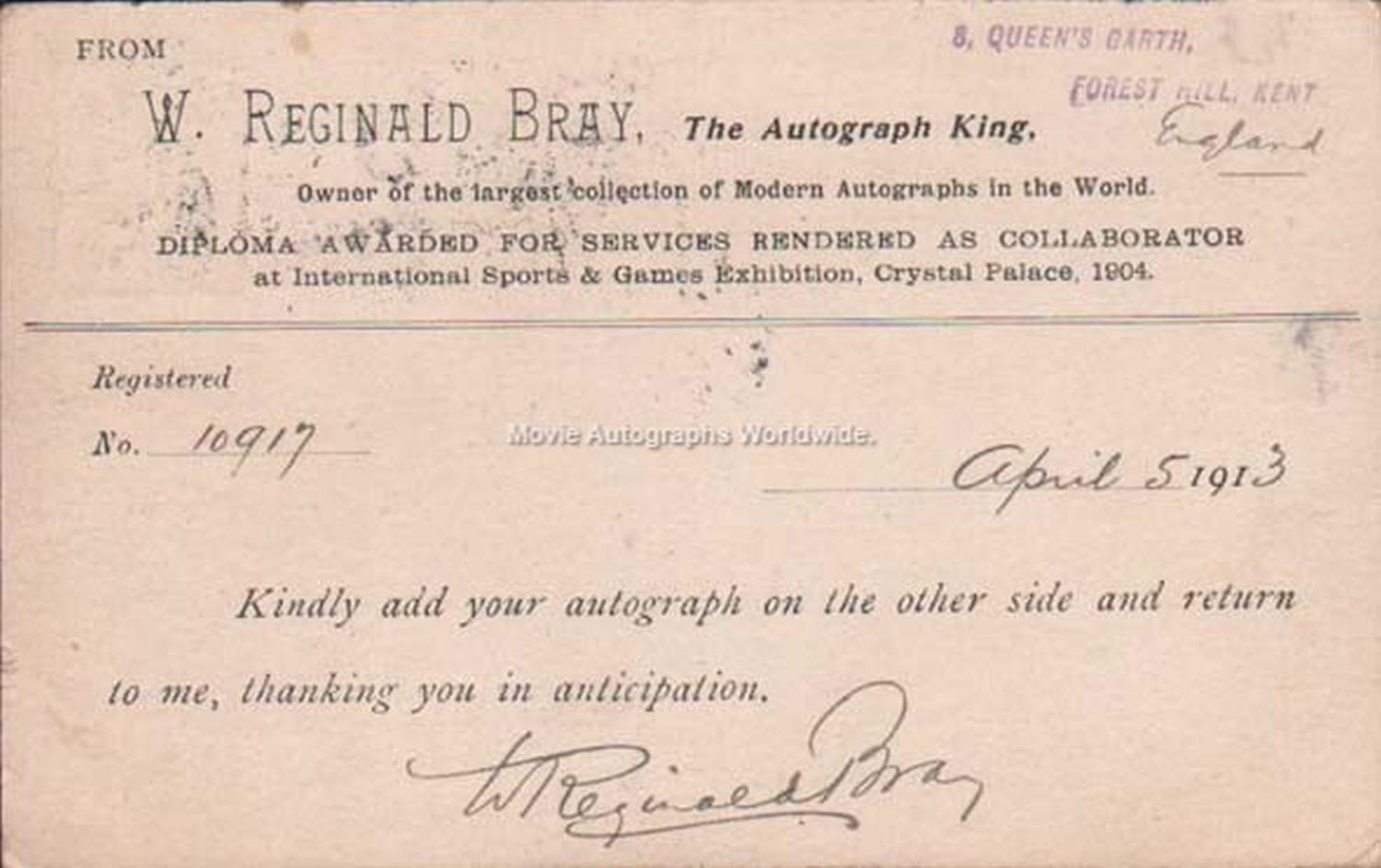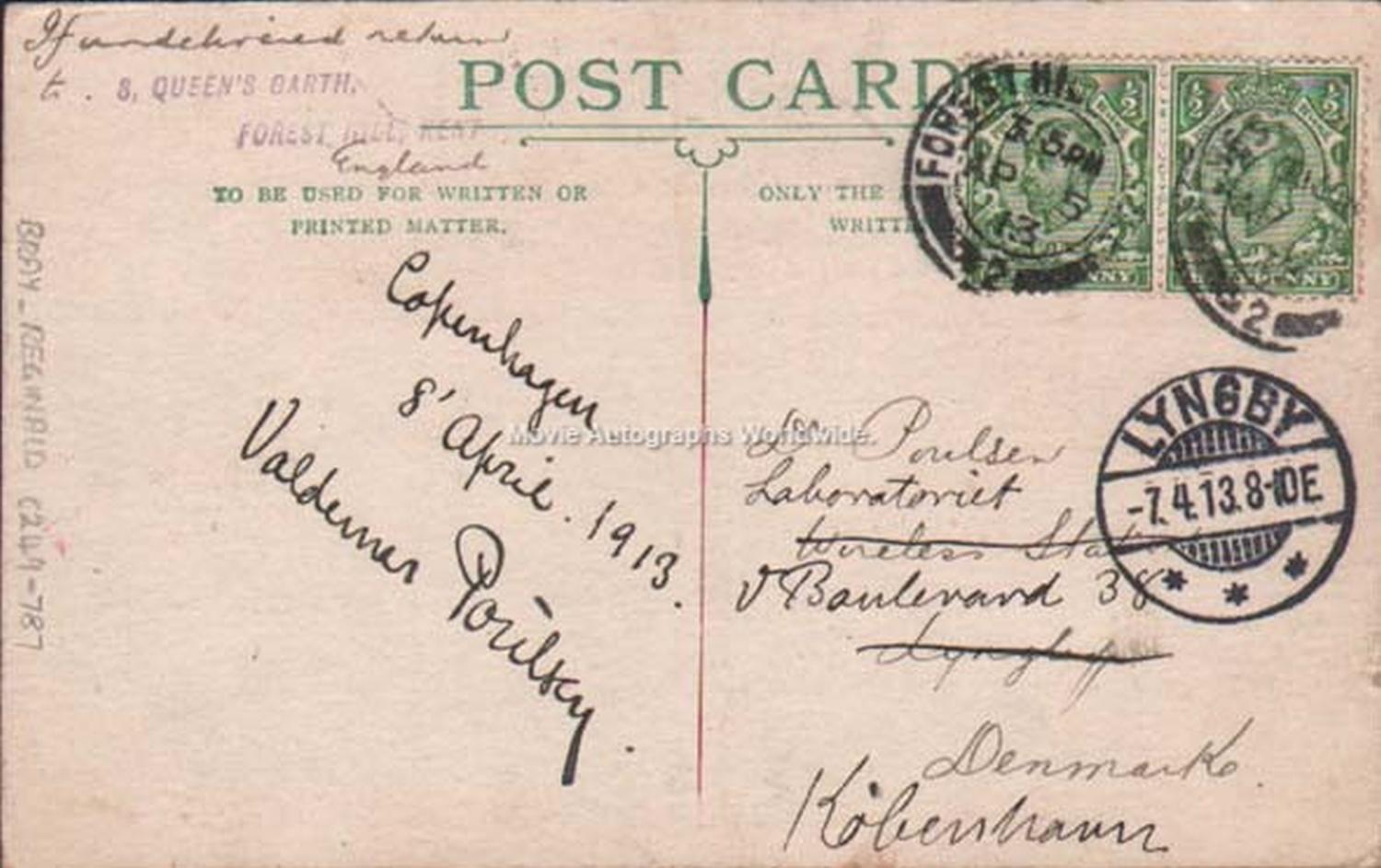 Postcard sent by Bray to Valdemar Poulsen on 5th April 1913 asking for his autograph.