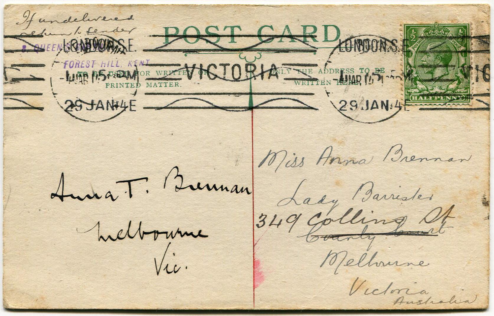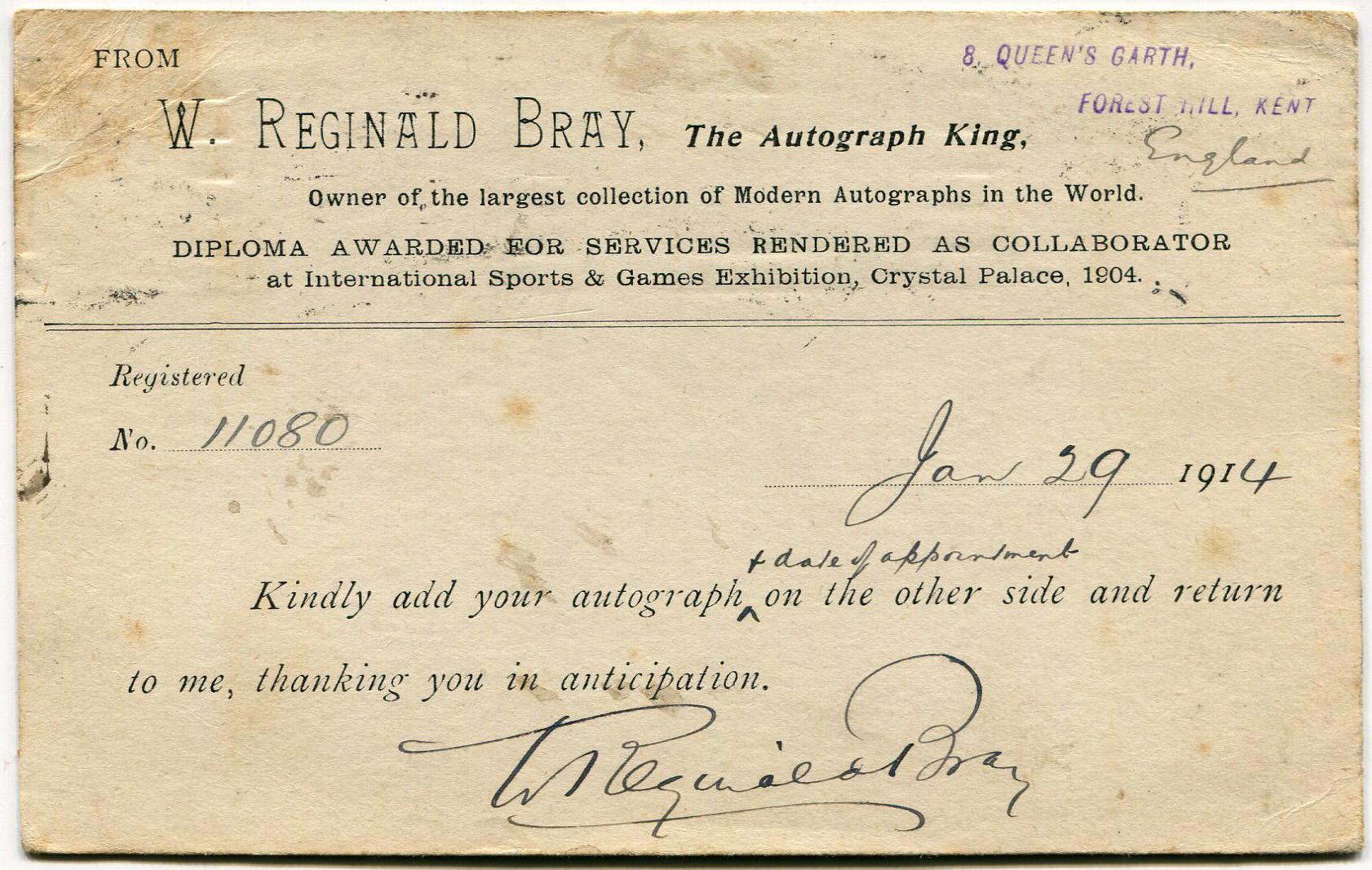 Postcard sent by Bray to Anna Brennan on 29th January 1914 asking for her autograph.