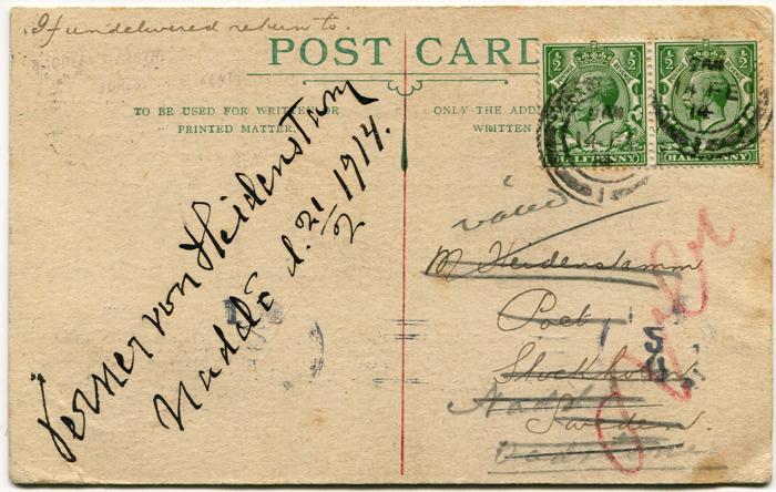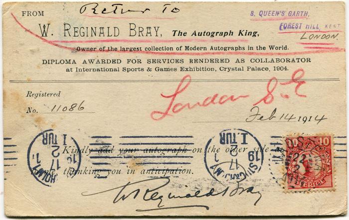 Postcard sent by Bray to Verner von Heidenstam on 14th February 1914 asking for his autograph.