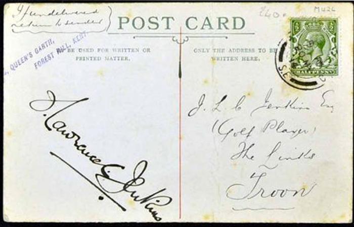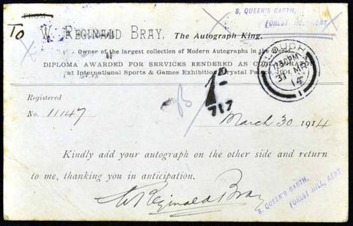 Postcard sent by Bray to JLC Jenkins on 30th March 1914 asking for his autograph.