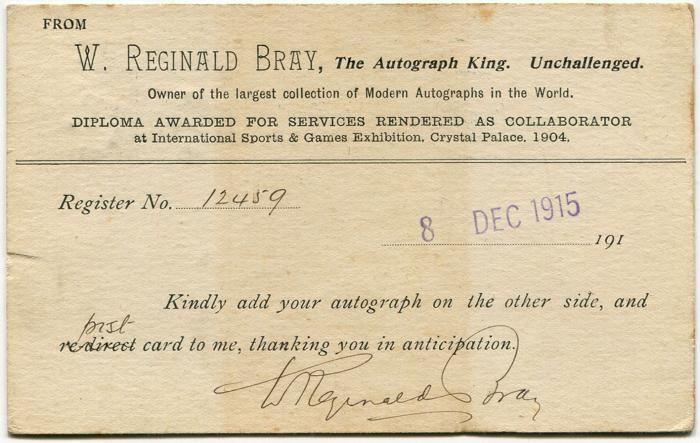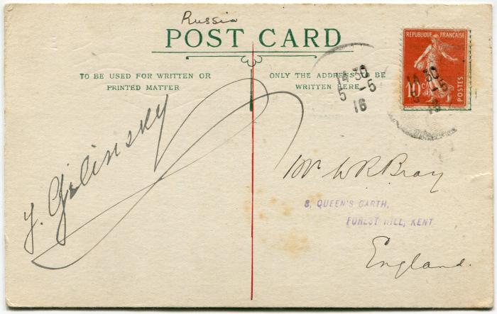 Postcard sent by Bray to General Yakov Zhilinski on 8th December 1915 asking for his autograph.