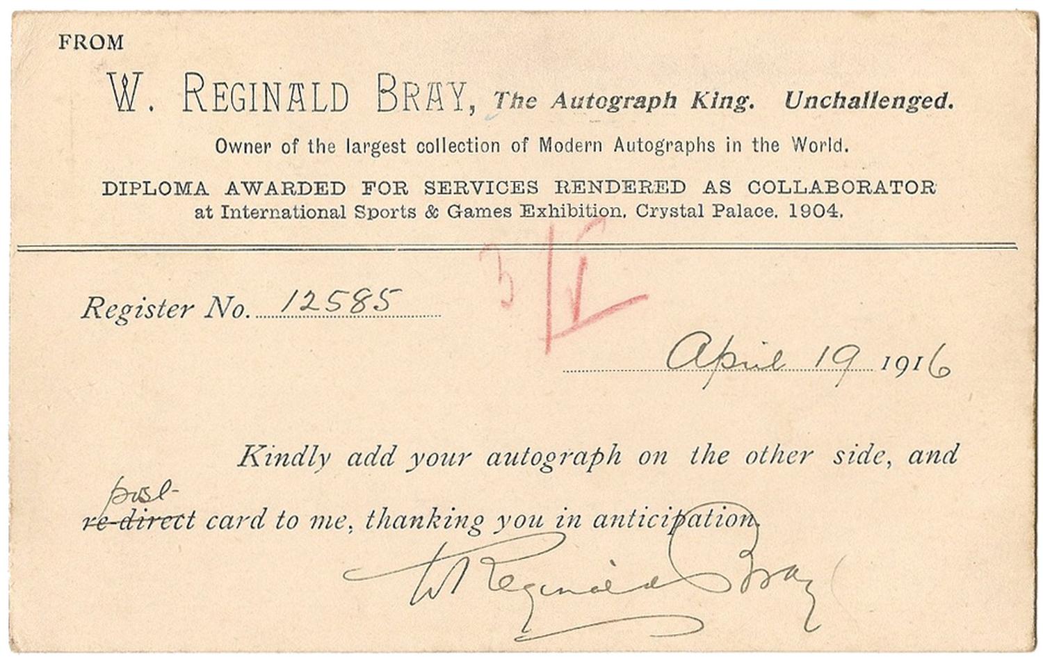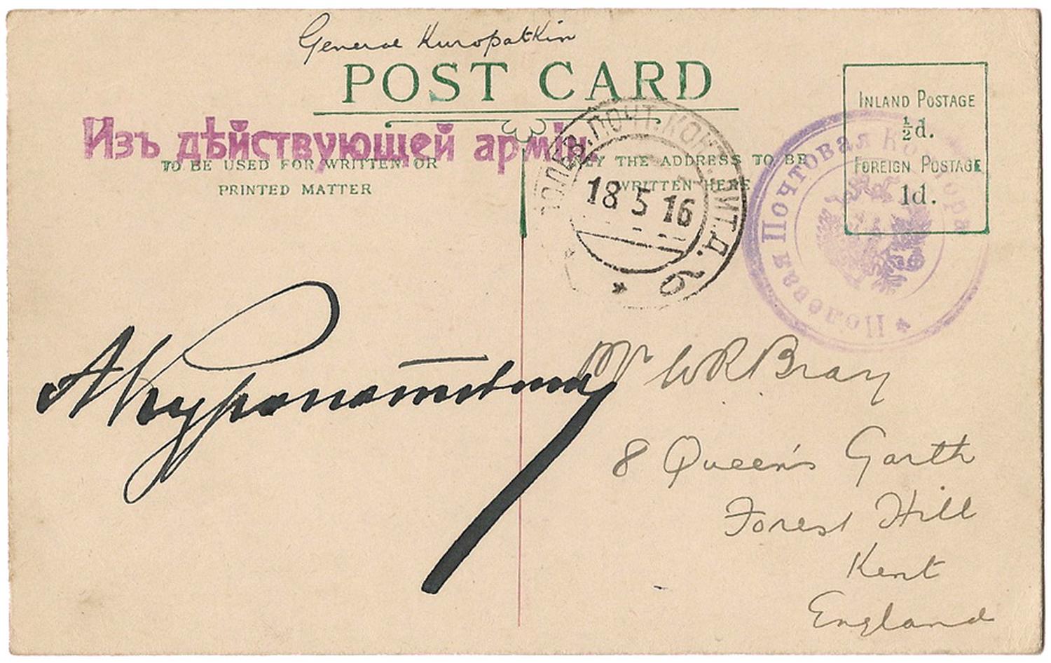 Postcard sent by Bray to Aleksi Nikolaevich Kuropatkin on 19th April 1916 asking for his autograph.