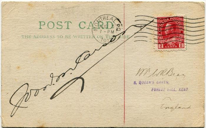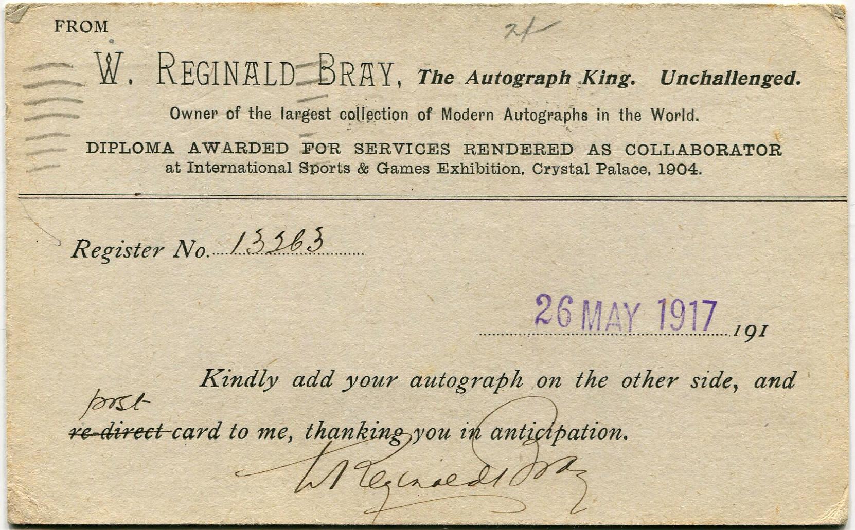 Postcard sent by Bray to J.M. Carson on 26th May 1917 asking for his autograph.