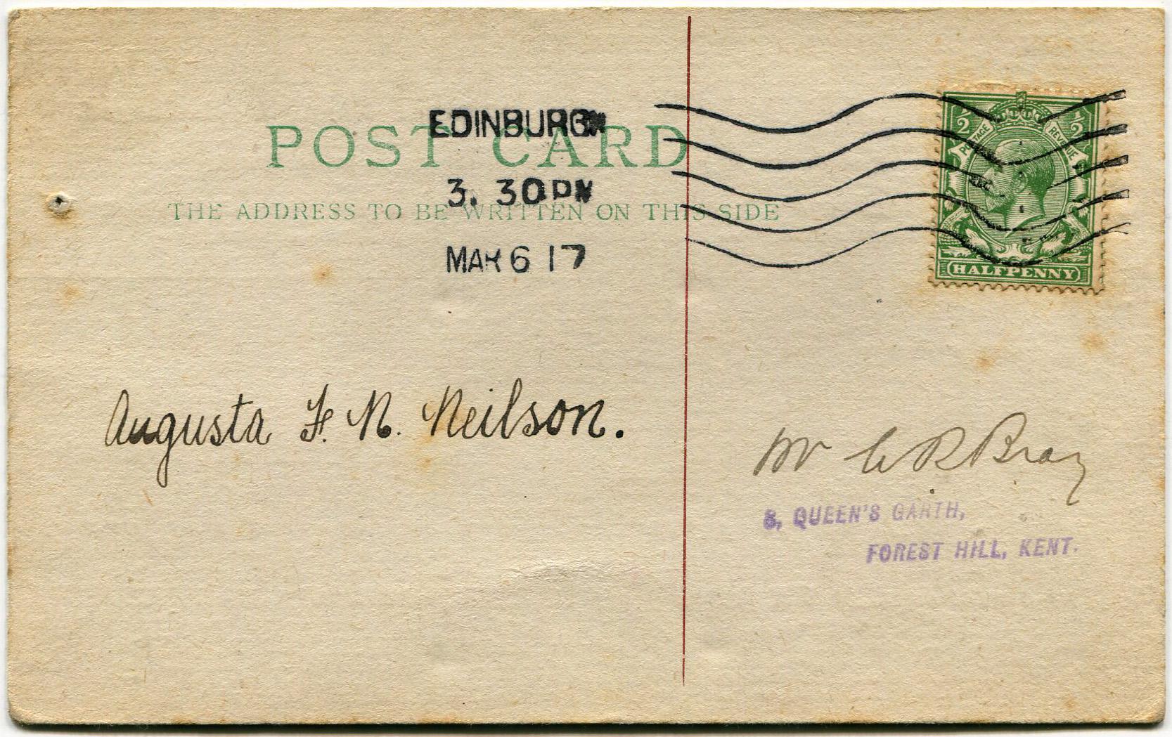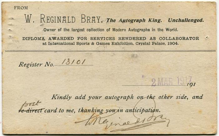 Postcard sent by Bray to Augusta Neilson on 2nd March 1917 asking for her autograph.