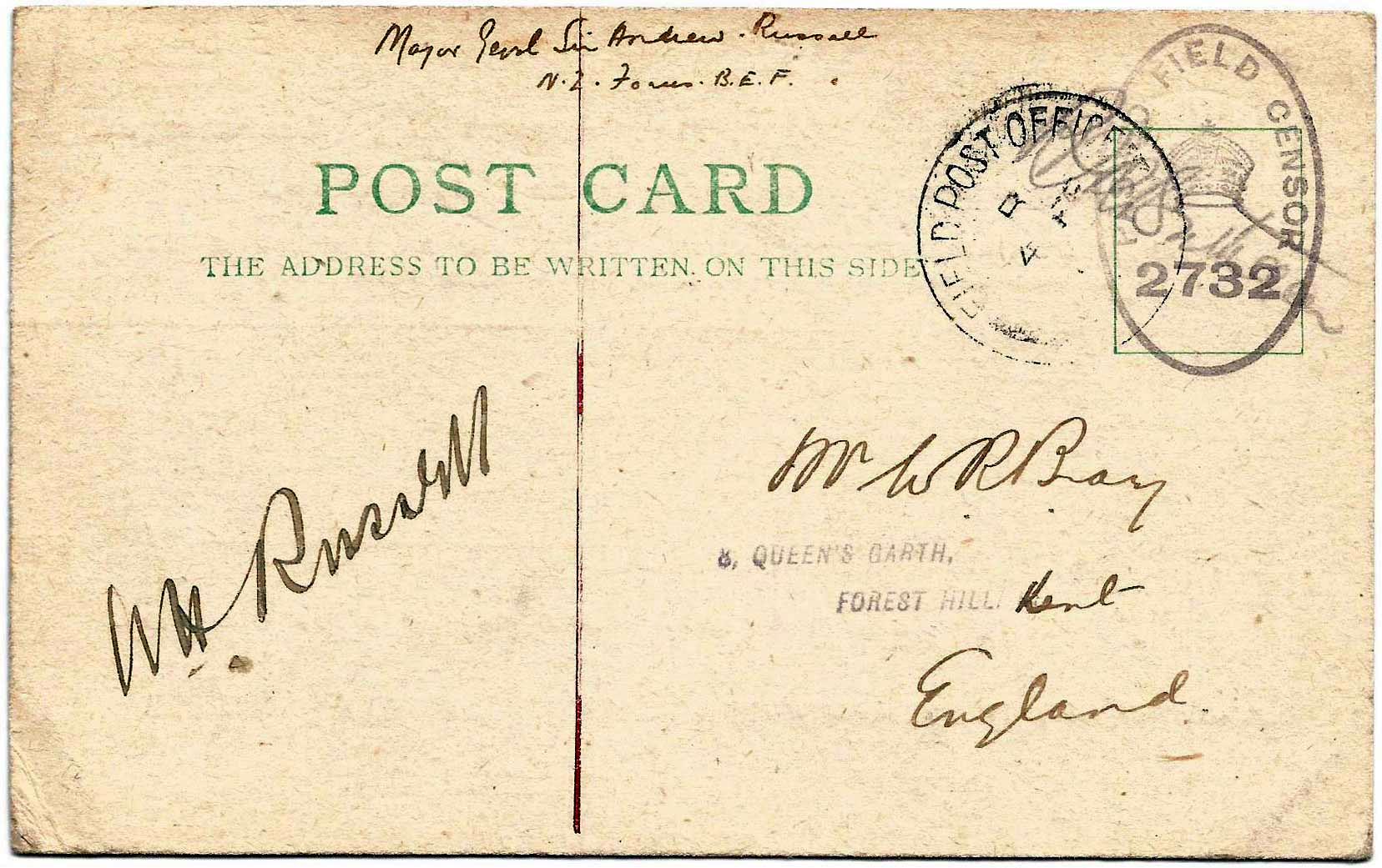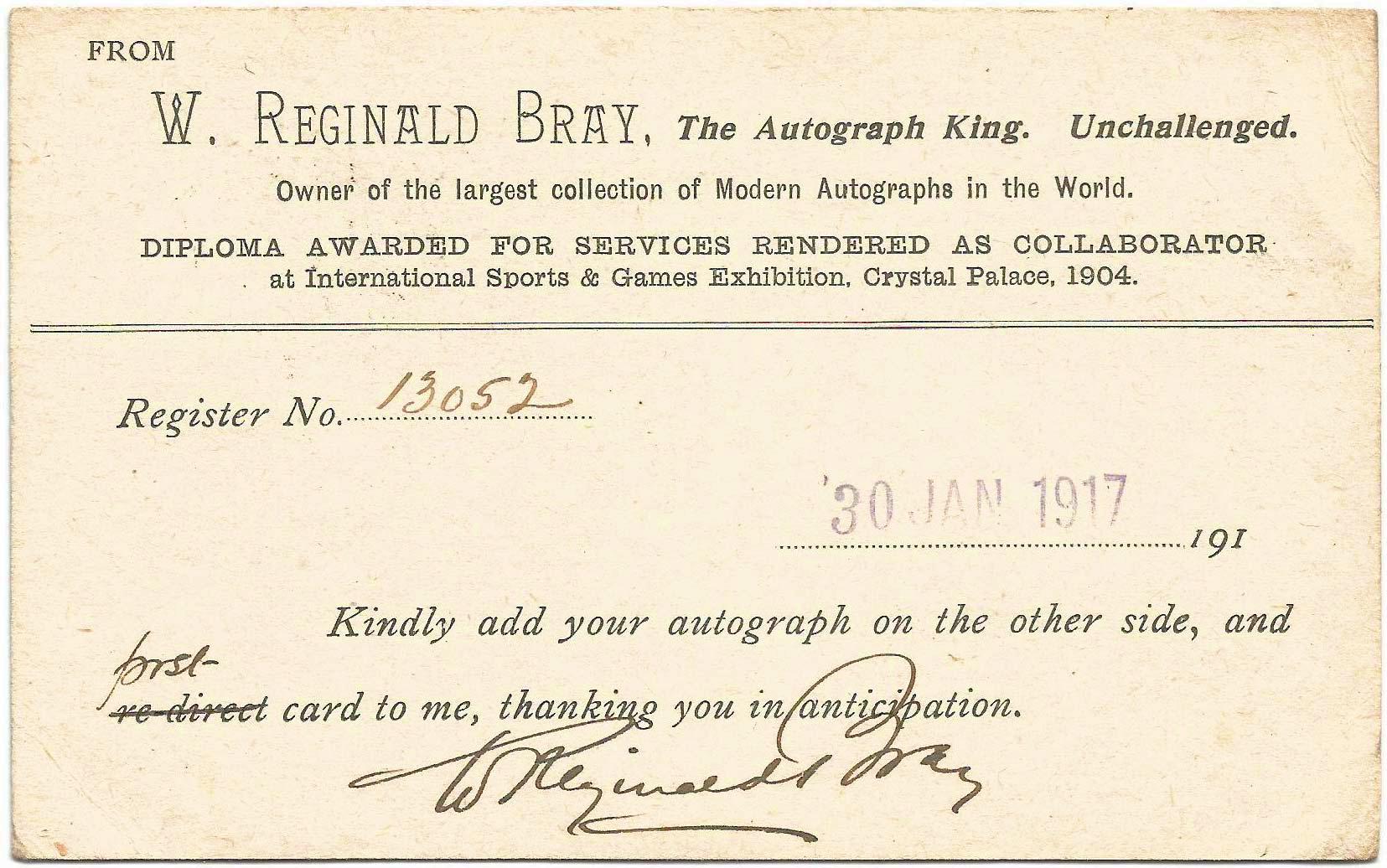 Postcard sent by Bray to Major General Sir Andrew Russell on 30th January 1917 asking for his autograph.