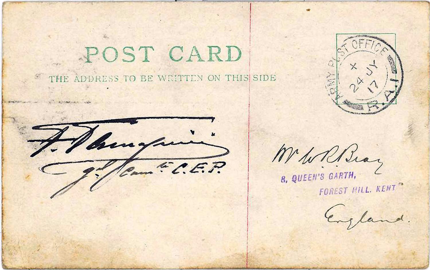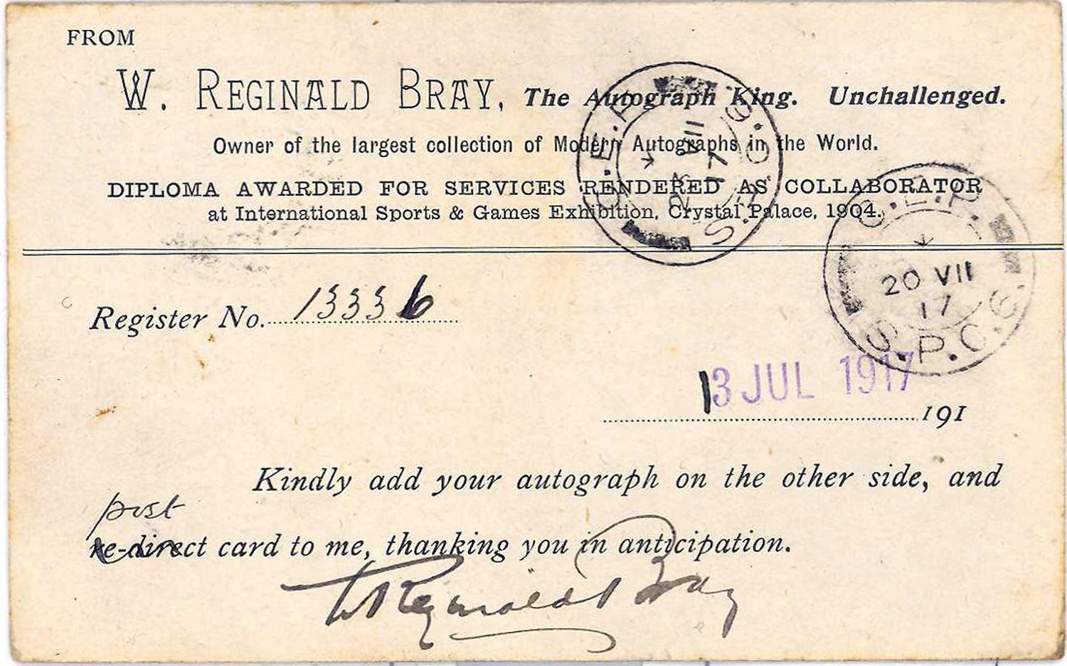 Postcard sent by Bray to General Fernando Tamagnini de Abreu e Silva on 13th July 1917 asking for his autograph.