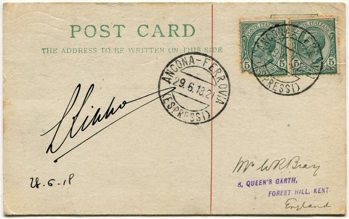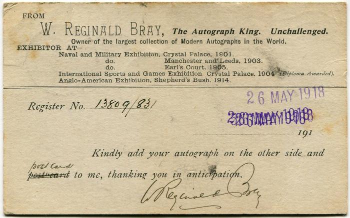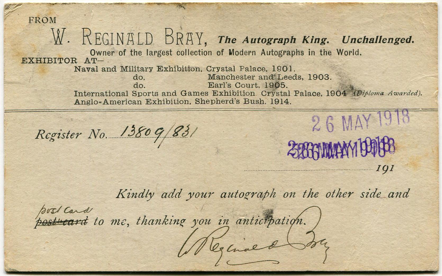 Postcard sent by Bray to (unidentified signature) on 26th May 1918 asking for his autograph.