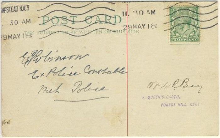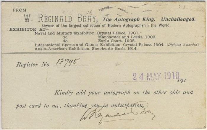 Postcard sent by Bray to E. Robinson on 24th May 1918 asking for his autograph.