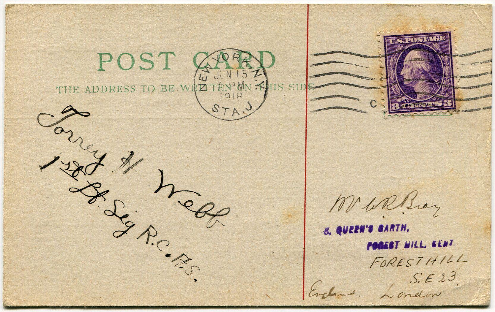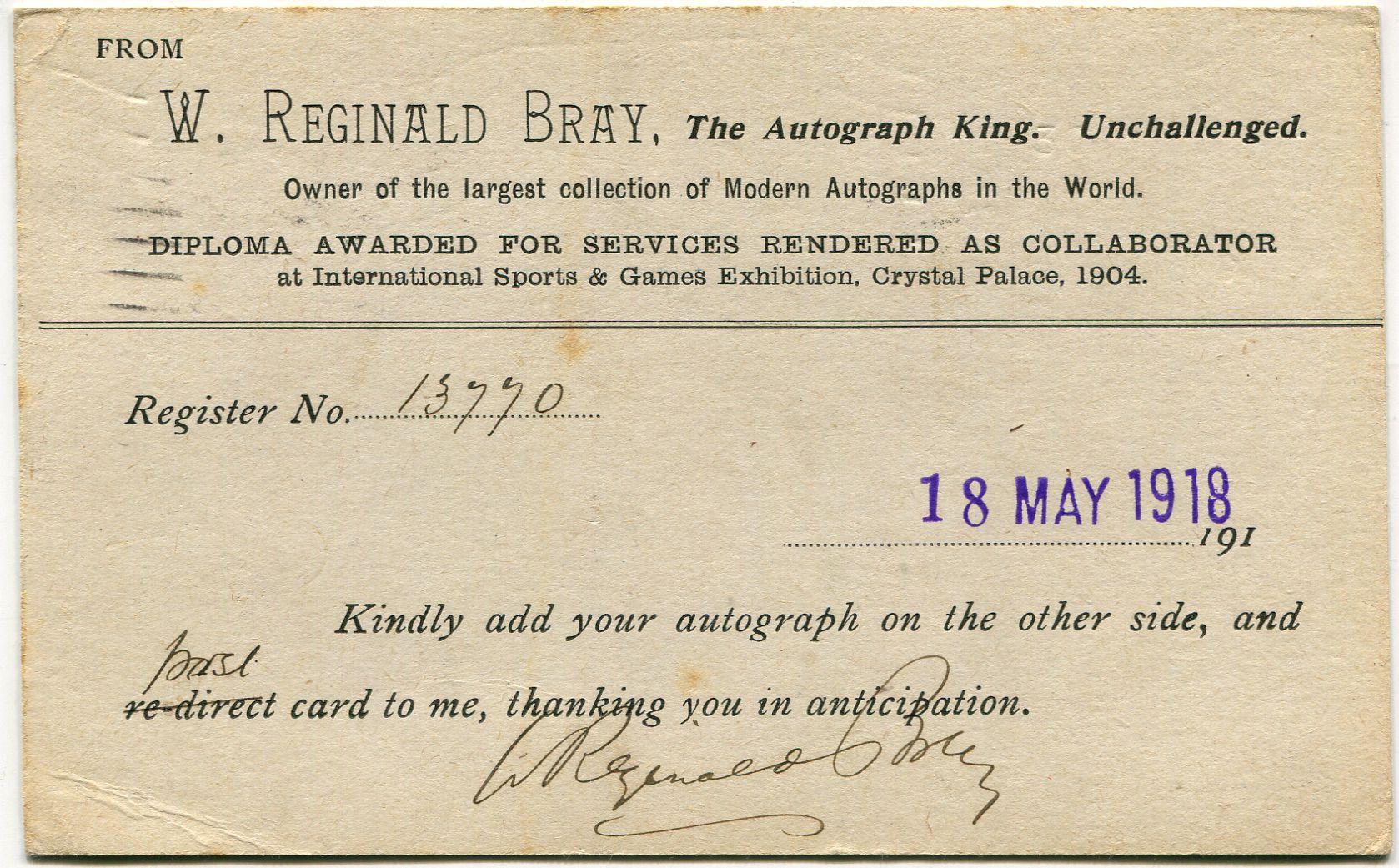 Postcard sent by Bray to Torrey H. Webb on 18th May 1918 asking for his autograph.
