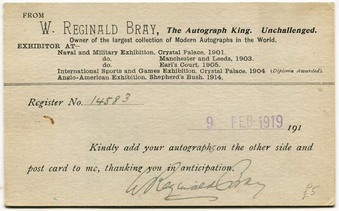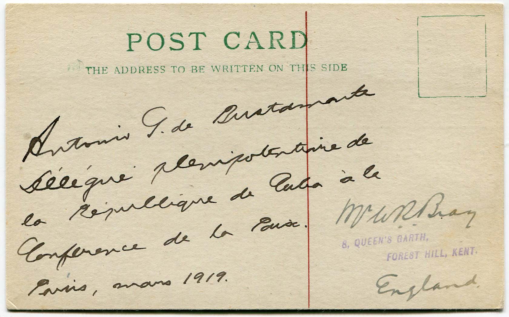 Postcard sent by Bray to Antonio Sanchez de Bustamante on 9th February 1919 asking for his autograph.