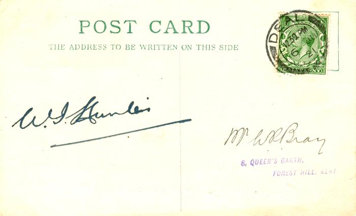 Postcard sent by Bray to W J Hunter on 24th March 1921 asking for his autograph.