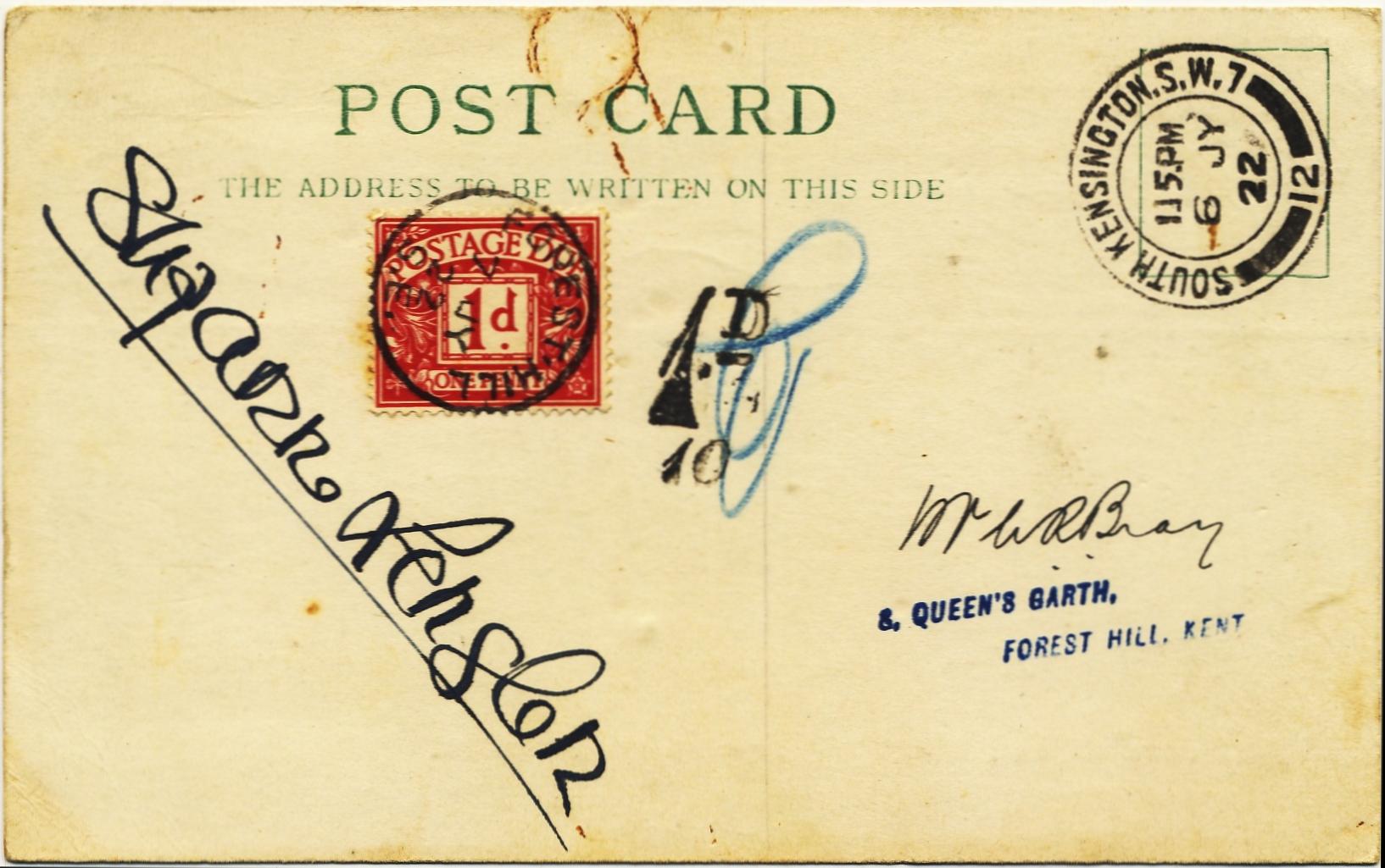 Postcard sent by Bray to Suzanne Lenglen on 1st July 1922 asking for her autograph.