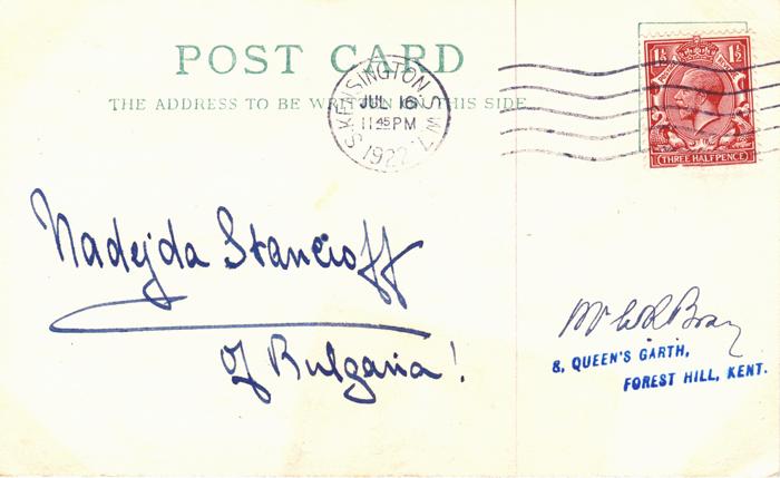 Postcard sent by Bray to Nadyda Stancioff on 14th July 1922 asking for his autograph.