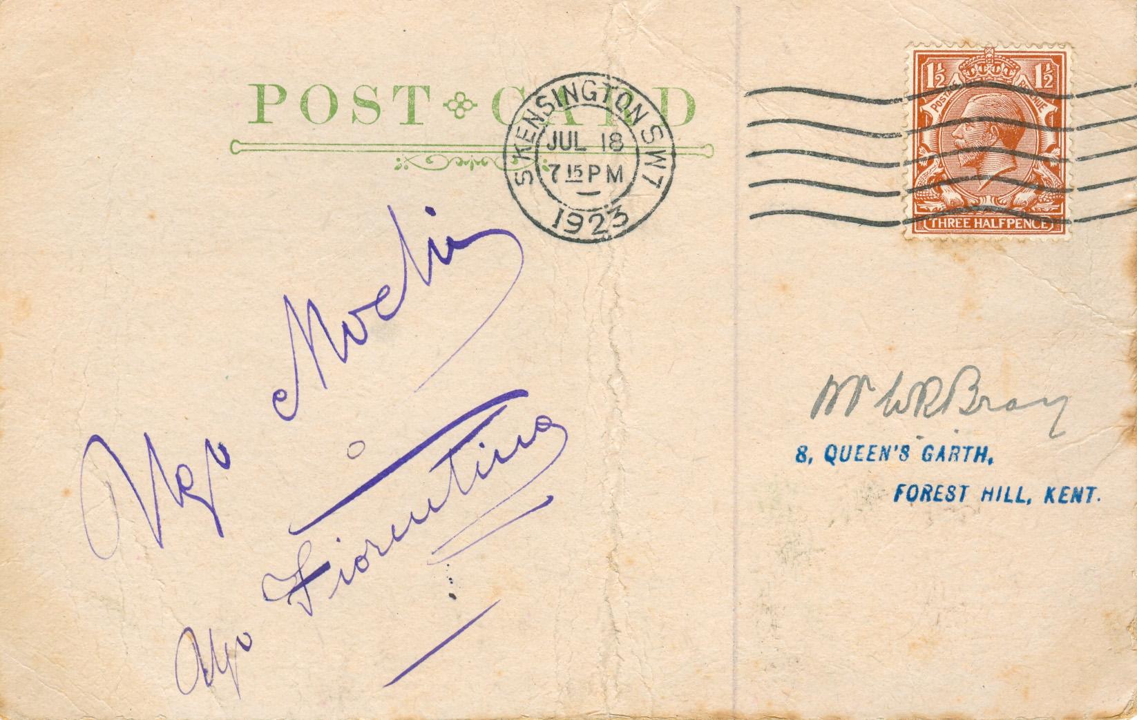 Postcard sent by Bray to Ugo Mochi on 1st May 1923 asking for his autograph.