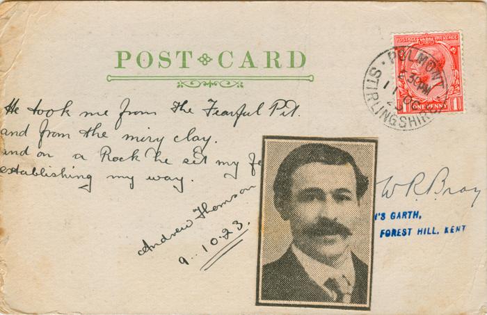 Postcard sent by Bray to Andrew Thomson on 6th October 1923 asking for his autograph.