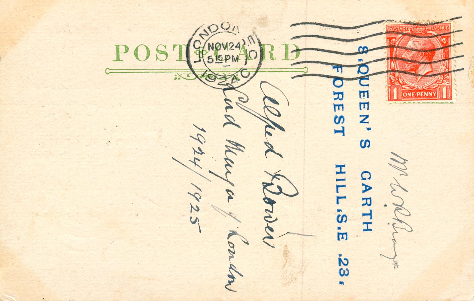 Postcard sent by Bray to Alfred Bower on 22nd November 1924 asking for his autograph.