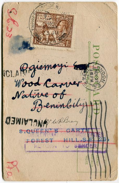 Postcard sent by Bray to Ogimoyi on 21st June 1924 asking for his autograph.