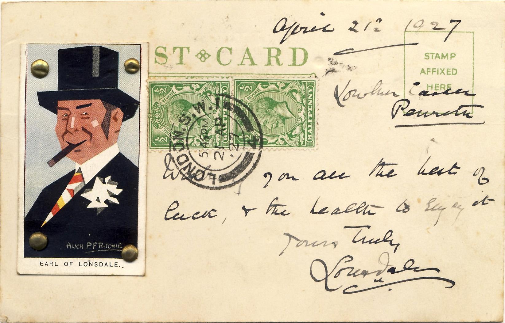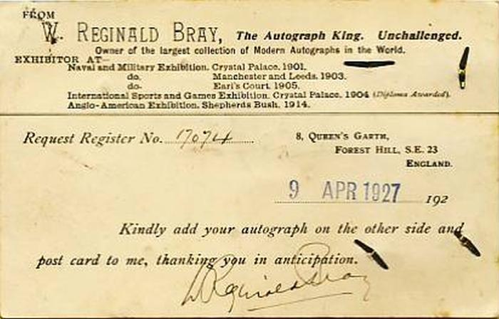 Postcard sent by Bray to Earl of Lonsdale on 9th April 1927 asking for his autograph.
